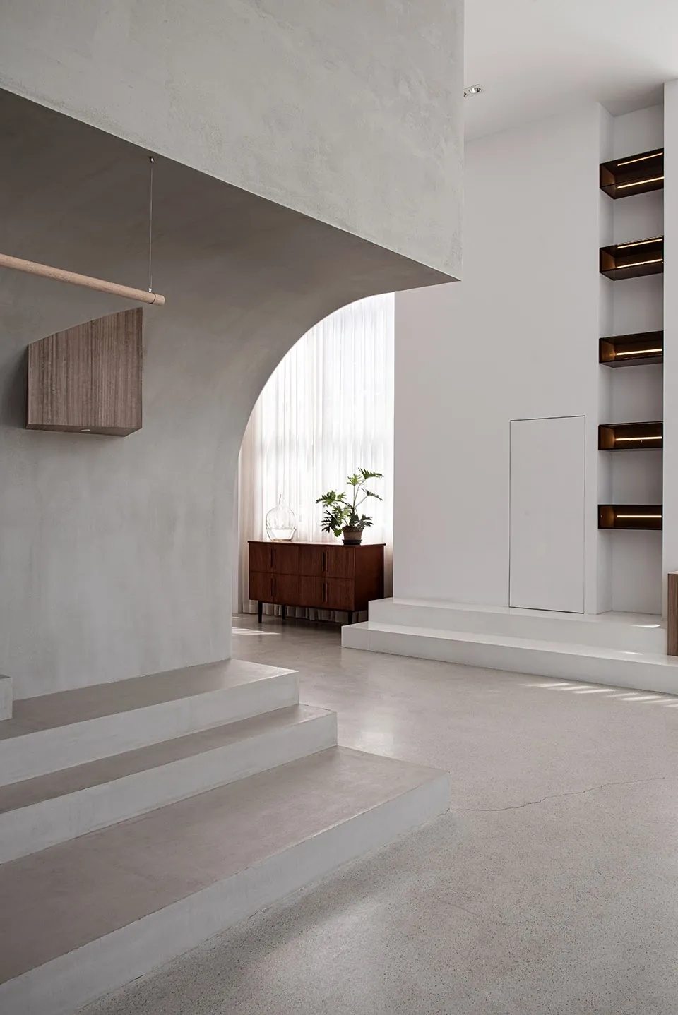 设计师在空间中铺设层层台阶,不仅提升了造型感同时也能作为展示和休息的功能。穿过门框来到会客区,大面积的的展示墙放置着主人从世界各地淘回的手工制品。特别设计了户外庭院,能够通往二层办公区,在这里可以开展一些手工作坊以及下午茶活动。