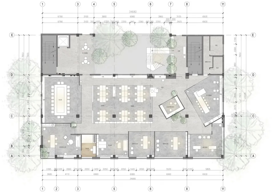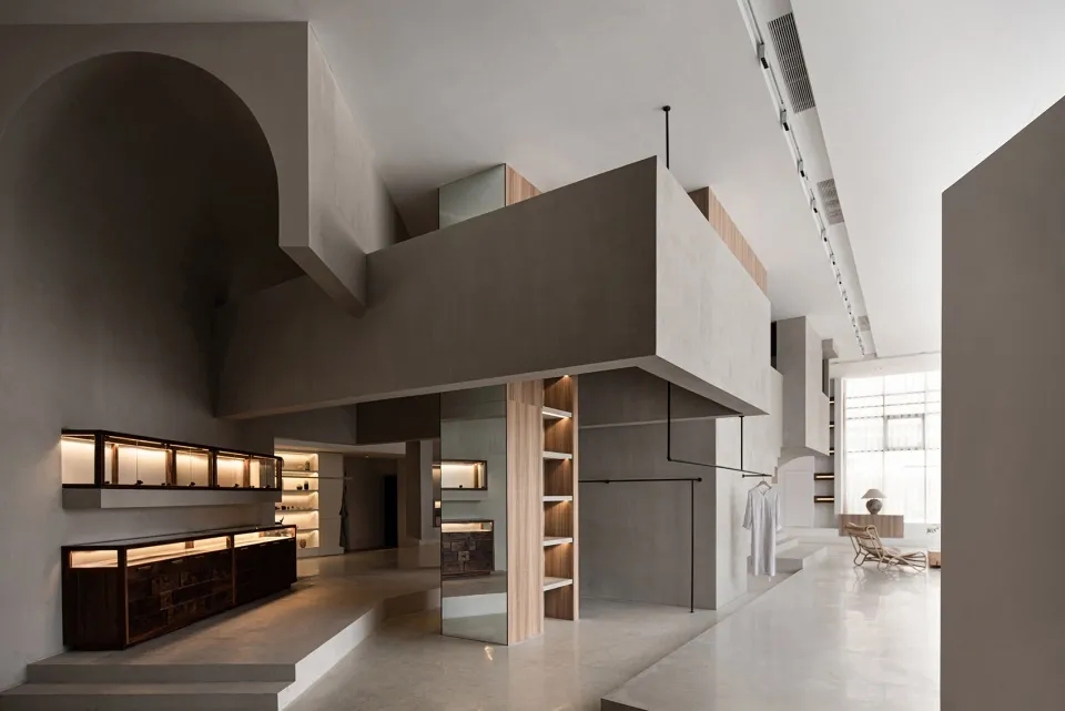结合麻霖的制衣理念,设计师将其延用在空间中,通过对苎麻植物造型的剖析与演变,打造出一片建筑体块,犹如在空间置入了一株株充满建筑感的植物,结合内部空间各处的功能特点,互相结合,任其自由生长。