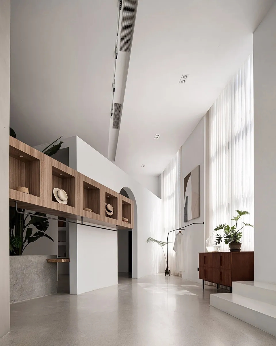 麻霖生活美学空间位于杭州滨江的一幢园区内,是一家以麻为主的线上原创服装设计品牌,主理人希望打造一个产品与体验结合的空间,能够更好地向客人展现麻霖的生活美学。整个空间中一层可供展示服装、帽子、珠宝以及世界各地淘来的手工艺品,二层作为综合办公区域,有着会议厅、办公室、直播间、仓库、客服部等等功能。