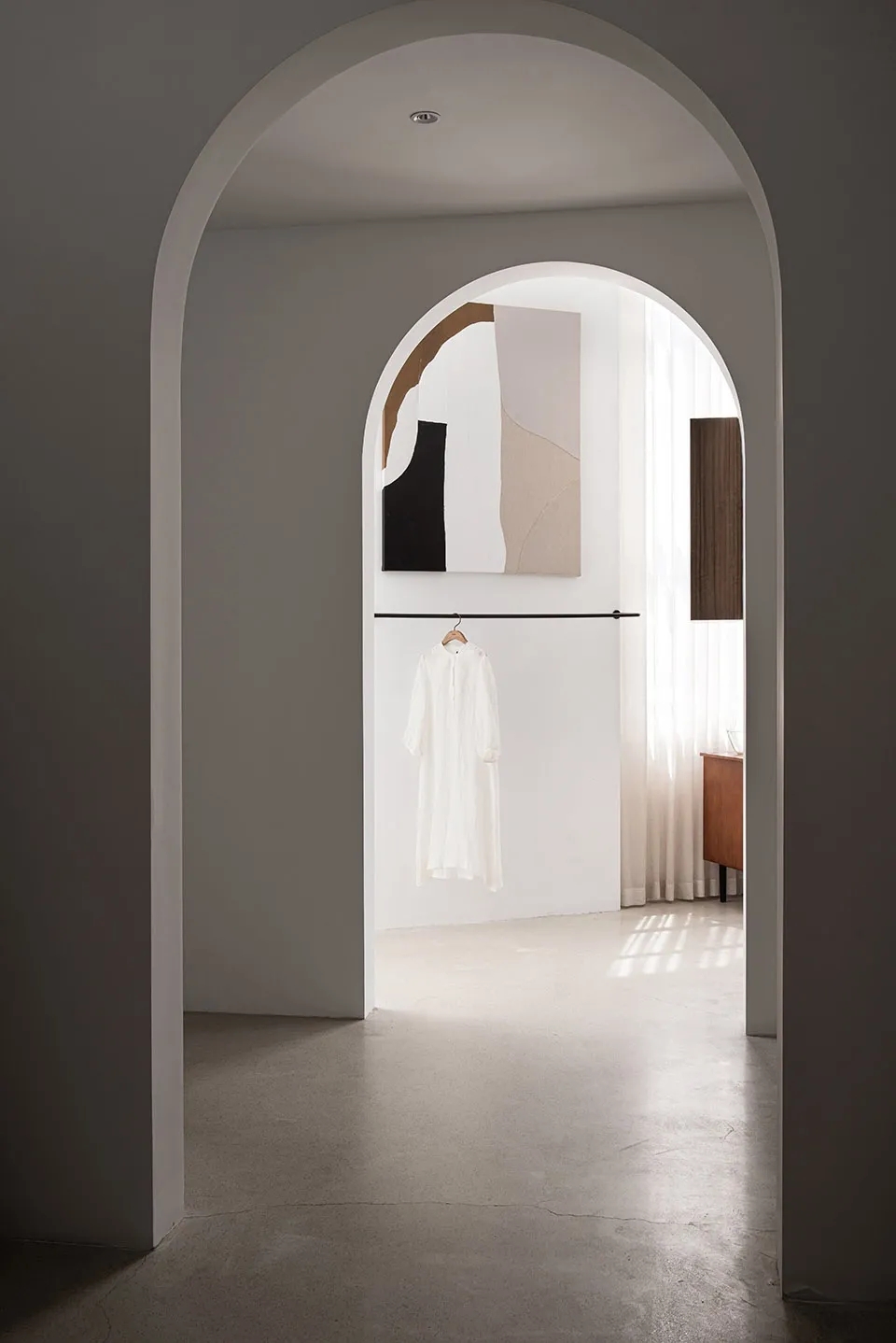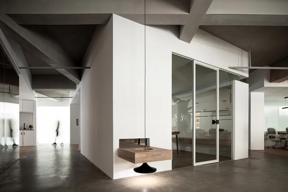 设计师将空间的本质发挥到极致,使用麻布料为顶部做了艺术造型装置,空间品位与品牌文化相辅相成。办公室设计以朴素、自然的侘寂(wabi-sabi)为调性,展现了麻霖对东方美学的崇尚态度。