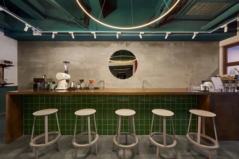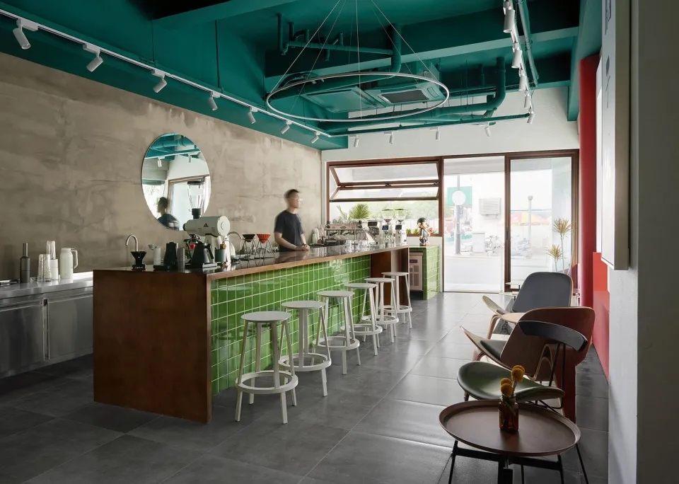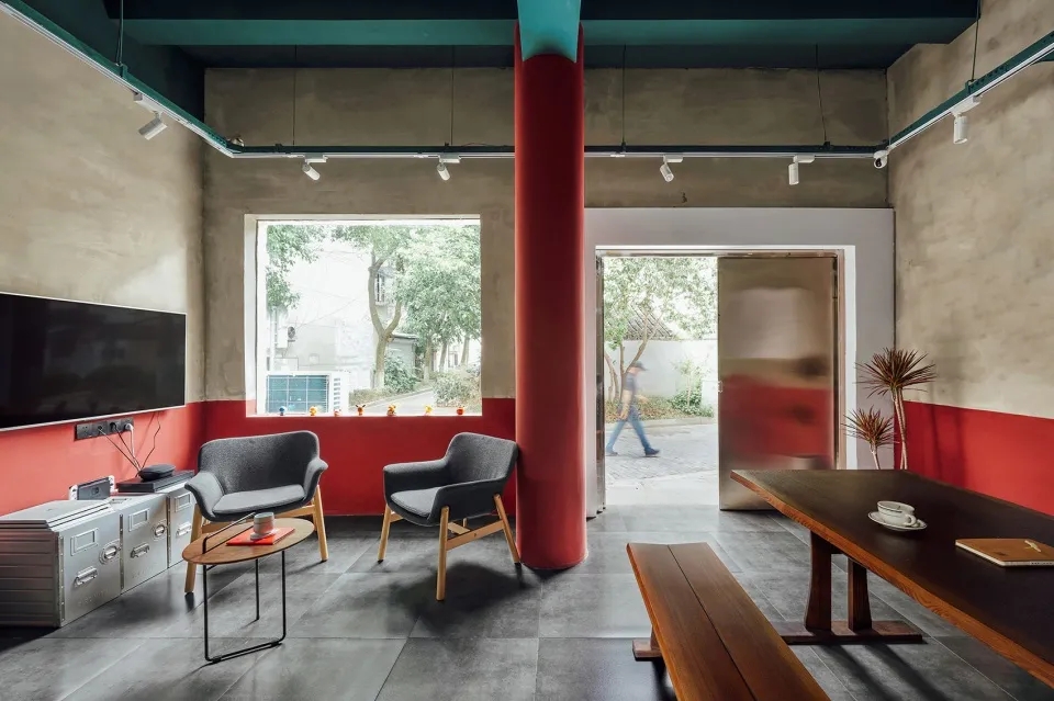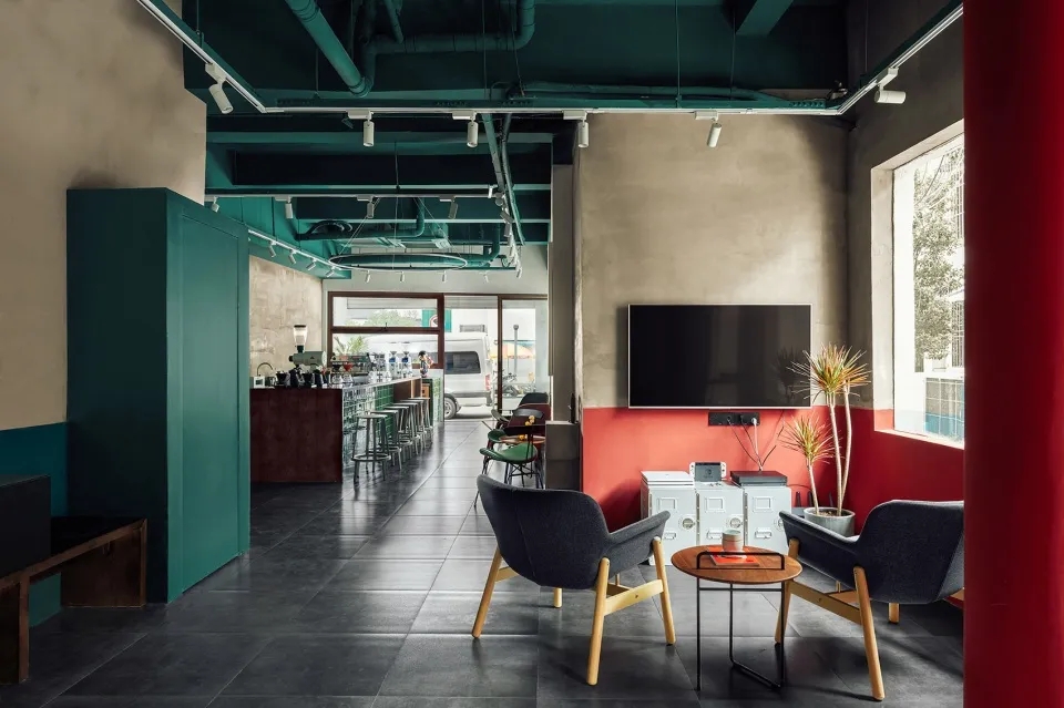 内部在保留原始结构基础上,以水泥墙面、水泥地砖为背景,通过选取马里奥兄弟的红色与绿色,将室内休闲区与功能区区分开。同一个室内空间,多种座位方式的尝试,根据每个人自己的喜好选择,完全不一样的体验。胡桃木色为主的家具与低饱和度色彩趣味的点缀,相互共存。