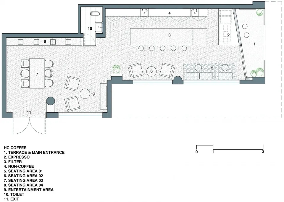 将空间划分为“入口露台”、“开放式厨房”、“起居室”、“餐厅”等;让每位参与进来的咖啡爱好者,都能成为胡扯“大家庭”的一员。内退式入口给露台提供了足够的空间,无论是在室内还是入口露台就坐,都能够在品尝咖啡的同时,与周围环境保持互动。