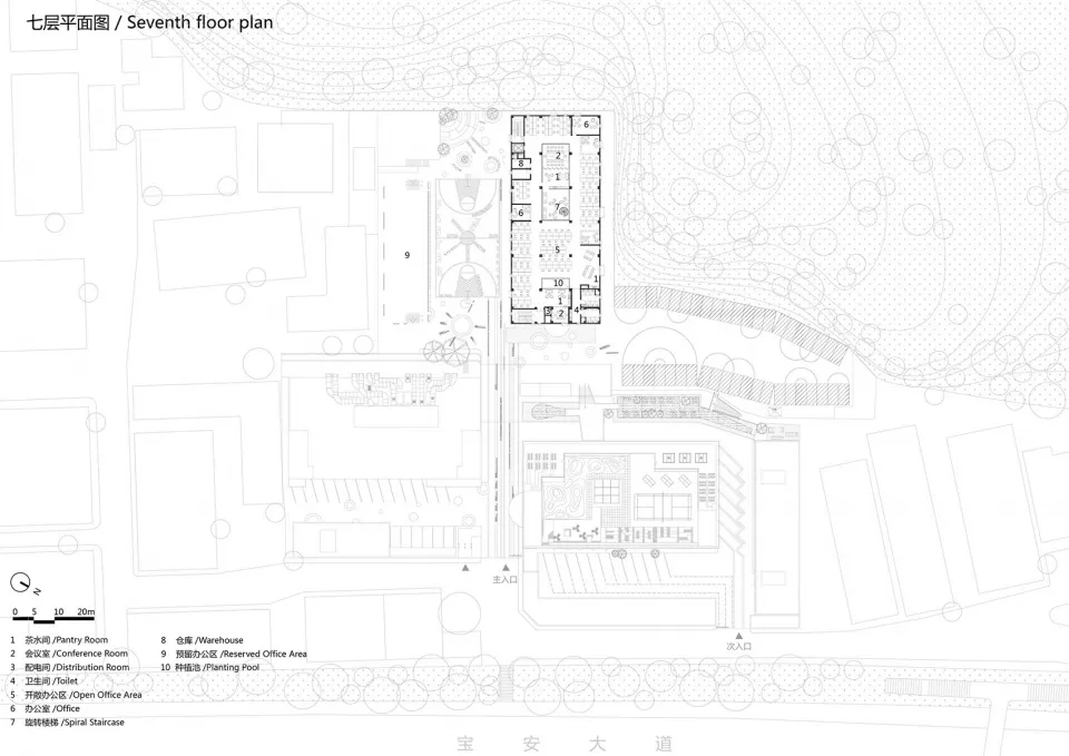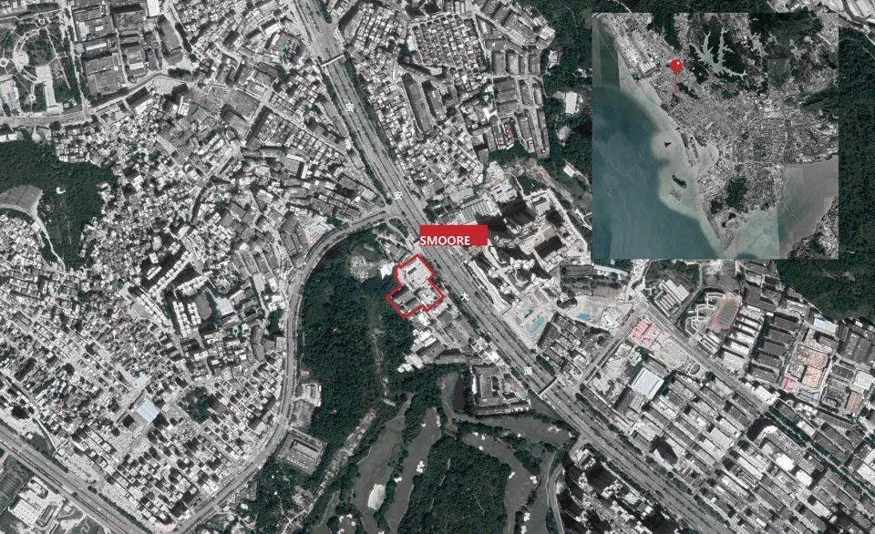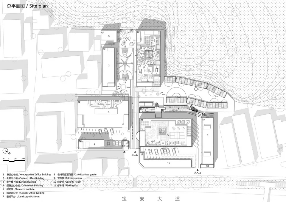 项目位于深圳宝安西乡街道固戍社区的东财工业园。东边毗邻宝安大道,北面为八九十年代工业区厂房和城中村,西南边为碧海湾高尔夫球场边缘山体,园区内西高东低,现状有三米高的陡坎。新的SMOORE总部由曾经的三个独立相邻的工业园合并组成,占地面积10917平米,总建筑面积28019平米,共九栋建筑。其中三栋上个世纪九十年代工业厂房,四栋宿舍楼,一组设备用房和一排临街道的商铺建筑。
