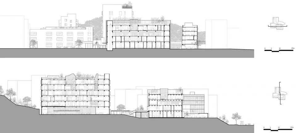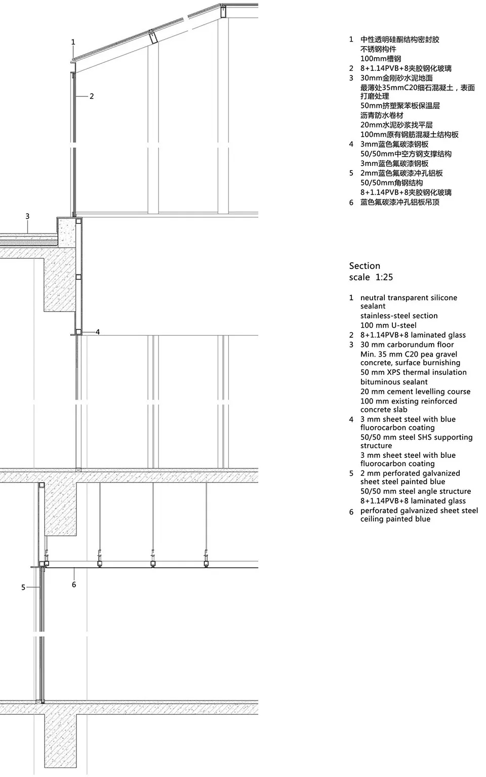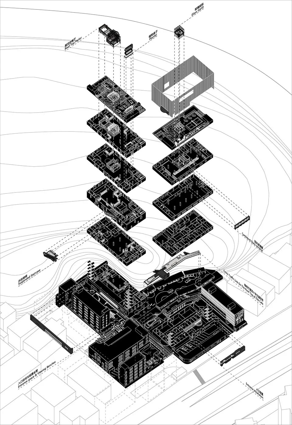 南立面首层插入一个以主入口门厅、雨棚、球场观众席及电梯间的连续建筑体。北边靠山体的夹层空间外挑与户外景观渗透。三四层因内部交通功能需求设计一个外挂楼梯,在立面上打破矩阵窗户均质的排列模式,重构了立面秩序。五六层根据平面布局设置了两个不同尺度的采光中庭:小尺度庭院内种植绿化景观延伸至屋顶花园;大尺度庭院在六层形成一个“公共客厅”,可通过旋转楼梯连接五层与屋顶景观空间。两个庭院仿佛一组玻璃装置从外部插入建筑,置入公共空间同时也给室内带来良好的通风采光,最终形成具有立体形态的第五立面。