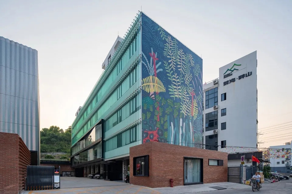 6#号楼栋作为园区北边的边界与东财工业区其它厂房分隔开,改造封闭后的走廊东侧形成一面完整的山墙立面,与5#楼一起成为重要的城市界面,邀请艺术家绘制整面墙的植物元素壁画,让建筑以艺术的视角呈现于城市景观中,又与背面的山体相融。面对园区的南立面外挂竖向排列的玻璃与5#楼立面既呼应又消隐。
