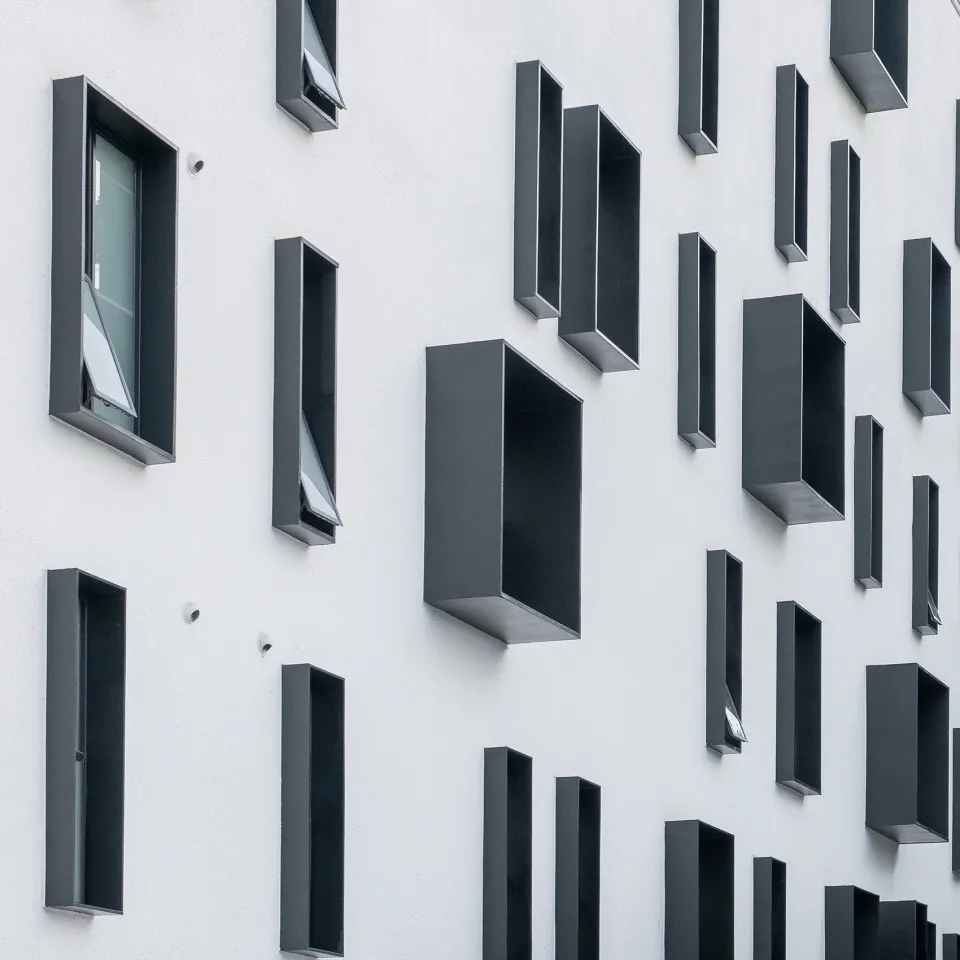 位于园区台地之上的1#楼改造后成为总部核心办公建筑。立面设计上采用了四种模数的矩形落地窗,加大了采光面需求,摈弃原有单一外窗效果,在原建筑马赛克立面上使用白色大颗粒弹涂,在光影下具有丰富的立面细节,结合外窗营造凹凸变化、错落有致的建筑立面。