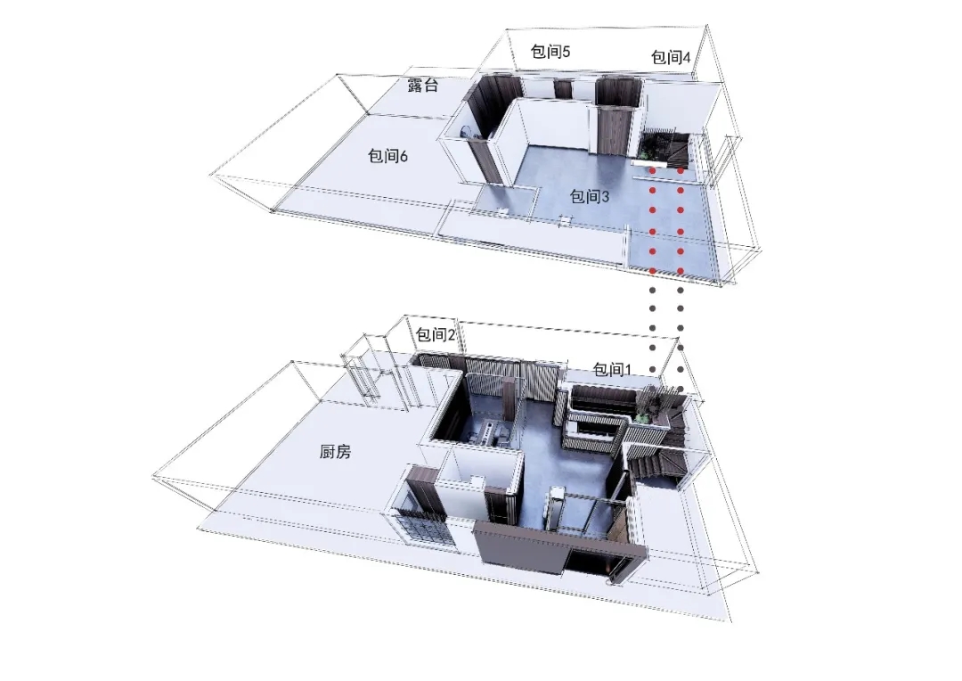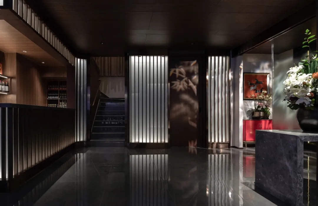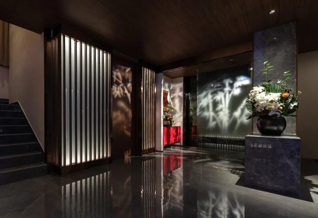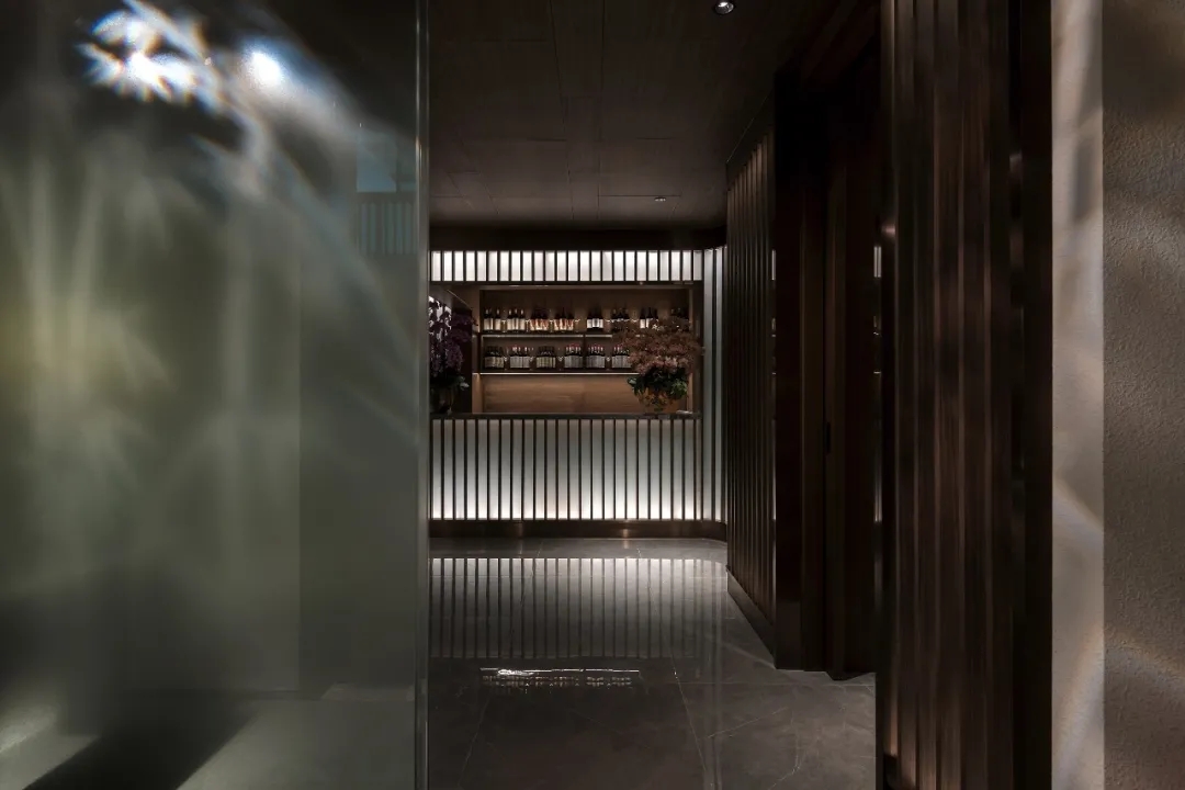 隐世之所 友名荟所在场地的前身是独立的老旧厂房 上下两层总面积480㎡,共有6个包房 进入会所后 一块影壁似的不透明玻璃隔档 阻拦了从入口向空间内观看的视线 既强调了友名荟私密的会所性质 又是对“犹抱琵琶半遮面”这一东方审美的恰当表达 当“竹”的剪影形象投射在玻璃上时 让人仿佛置身葱绿的竹林,更加想步入深处一窥究竟