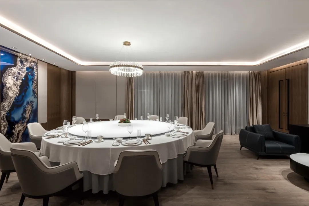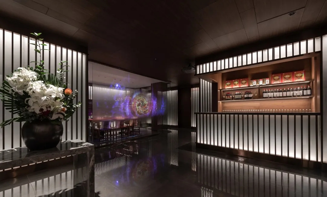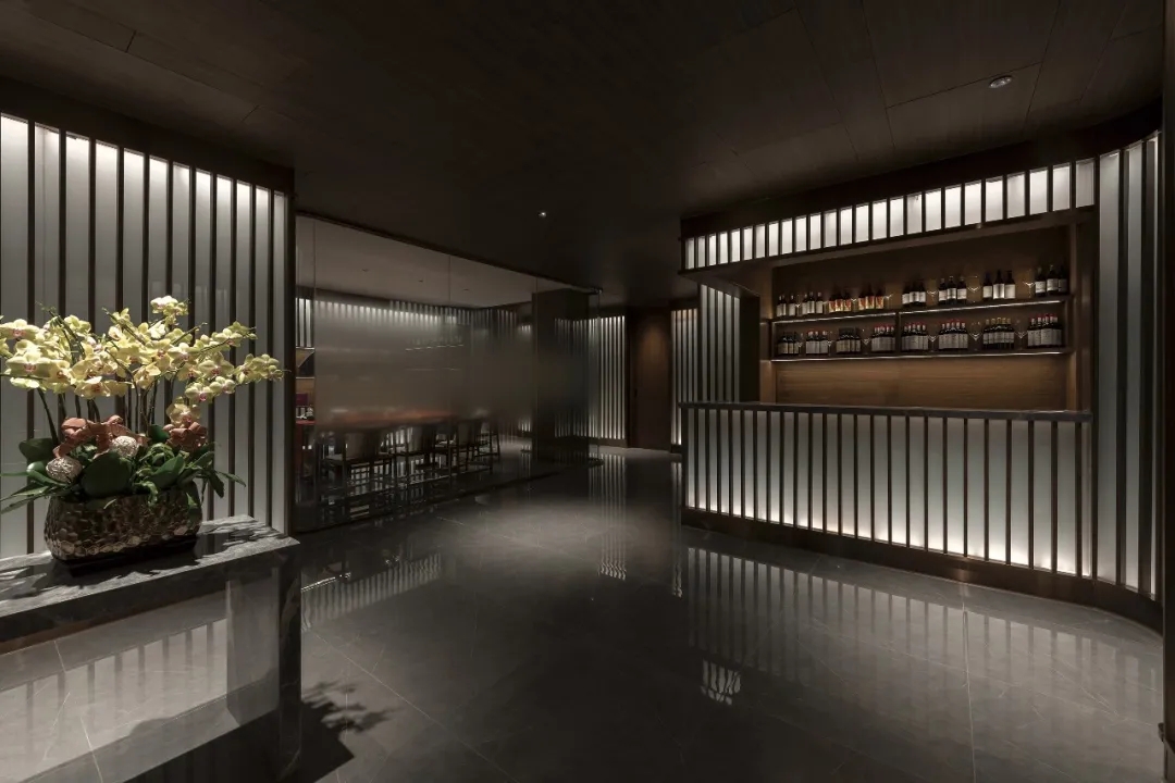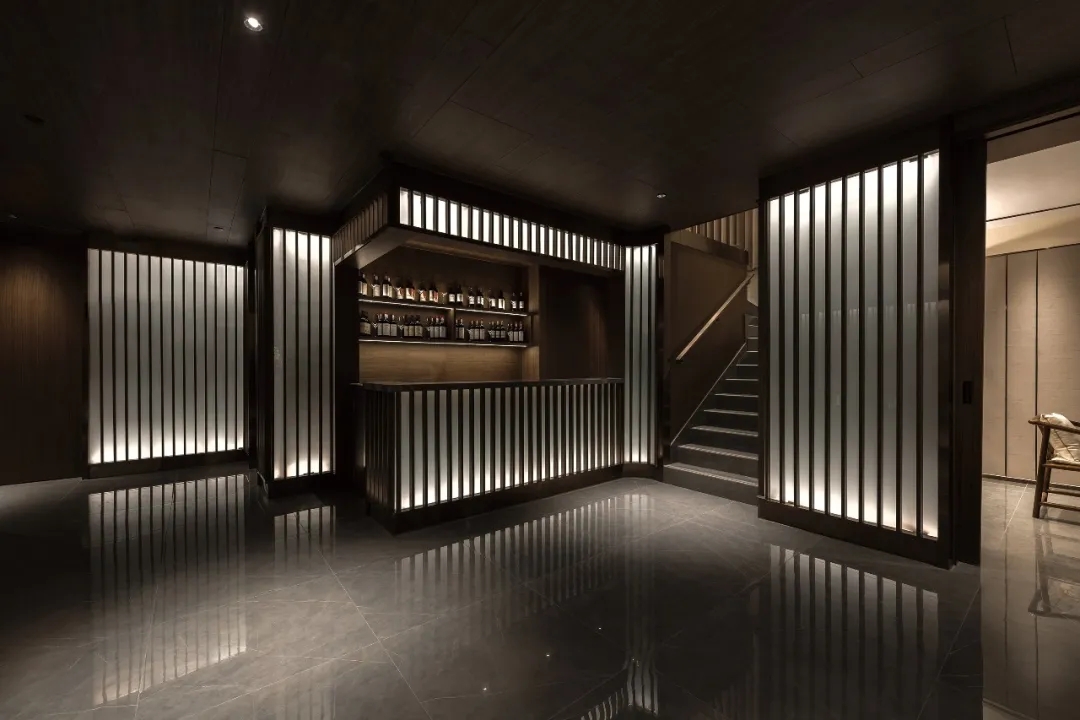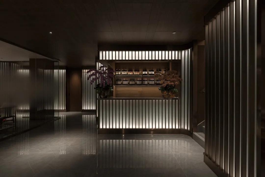 友名荟内 装饰栅格的灯光墙组成大的块面,将两层空间串接起来 加上深棕木色调与白色交相穿插 如同节奏与韵律和谐的建筑立面 将整个会所概括在统一且简洁的视觉语言中 而柔和的发光墙体与光带 则为空间渲染出雅致、幽静的氛围