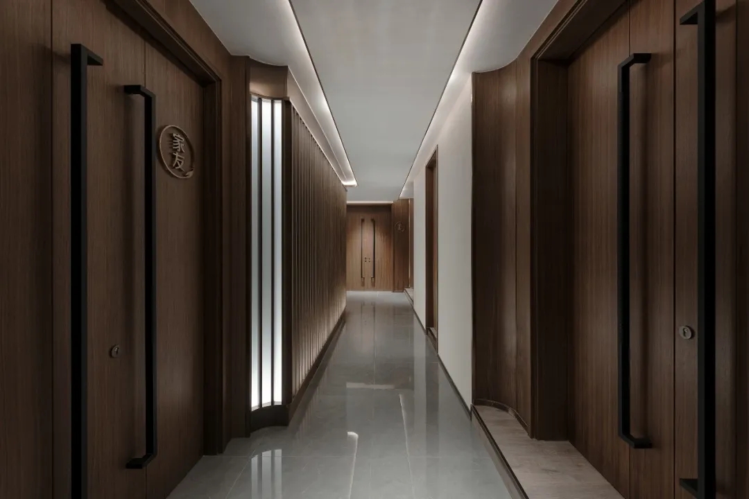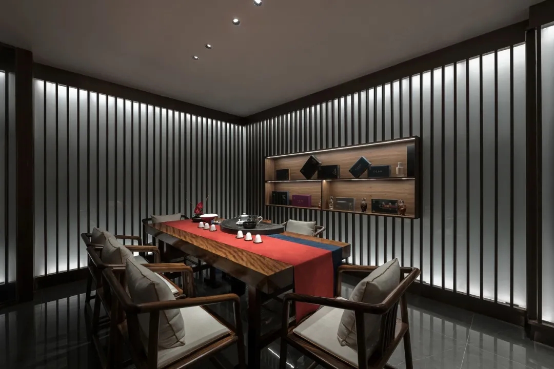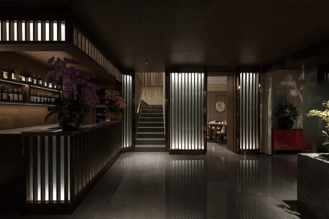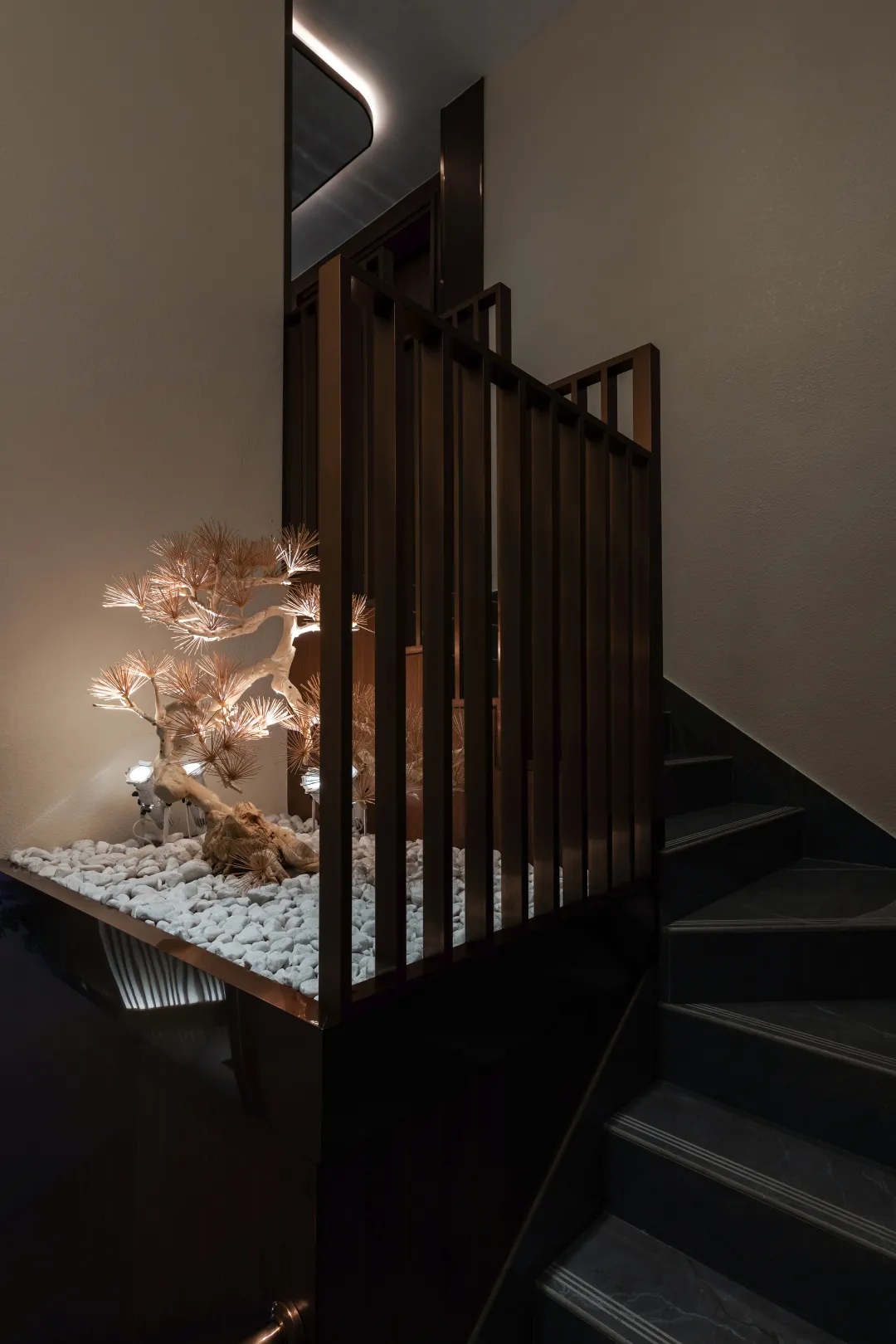 从吧台处拾阶而上 栅格墙面与房门之间用圆润的弧形角度连接 微妙的进深赋予连廊“曲径通幽”的基调 与入口处的“竹林”形成精神与气韵上的贯通 而“竹”又与台阶转角处的“松”呼应 是意喻草木繁盛的“荟”字的精神写照 同时又恰到好处为空间勾勒出 贤人雅士聚集于此的高雅意境