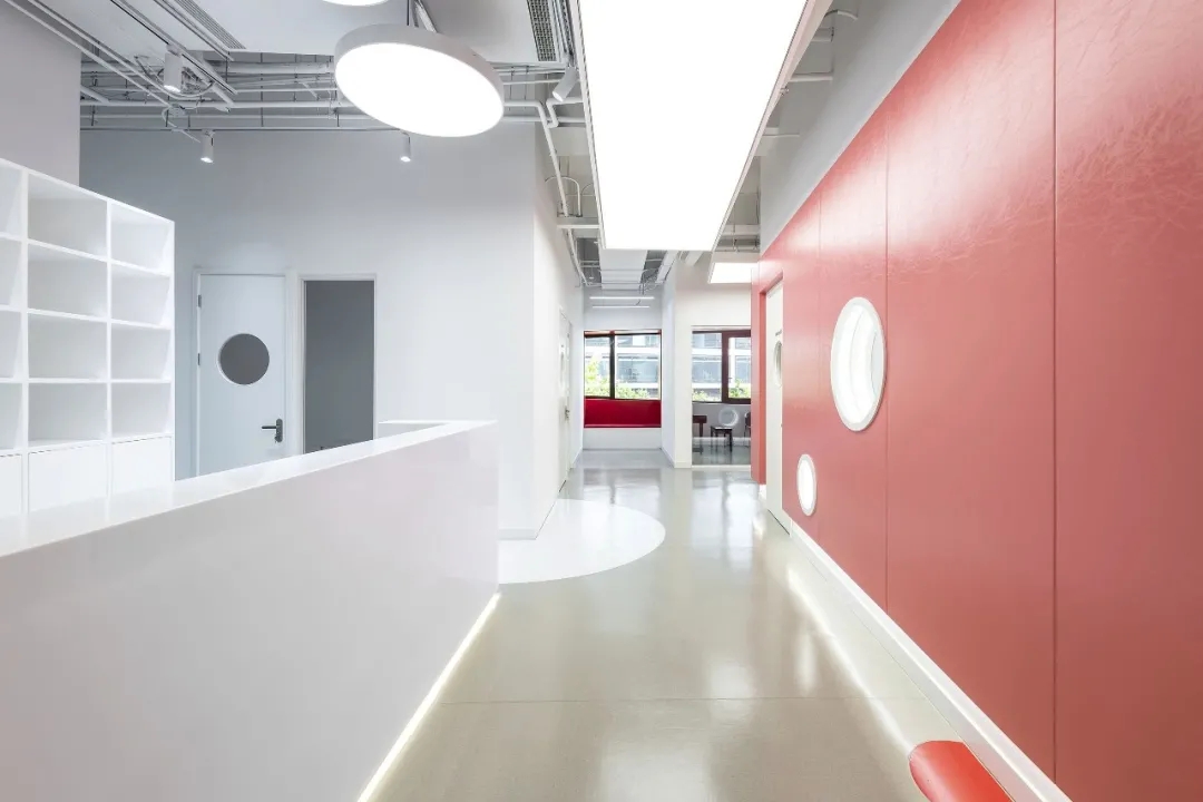 地面上看似随意排布的圆形色块与彩色墙面错落呼应,由更明艳的红色块所包裹的窗棂在音乐艺术中心纯净白色主色调的映衬下更显活泼。