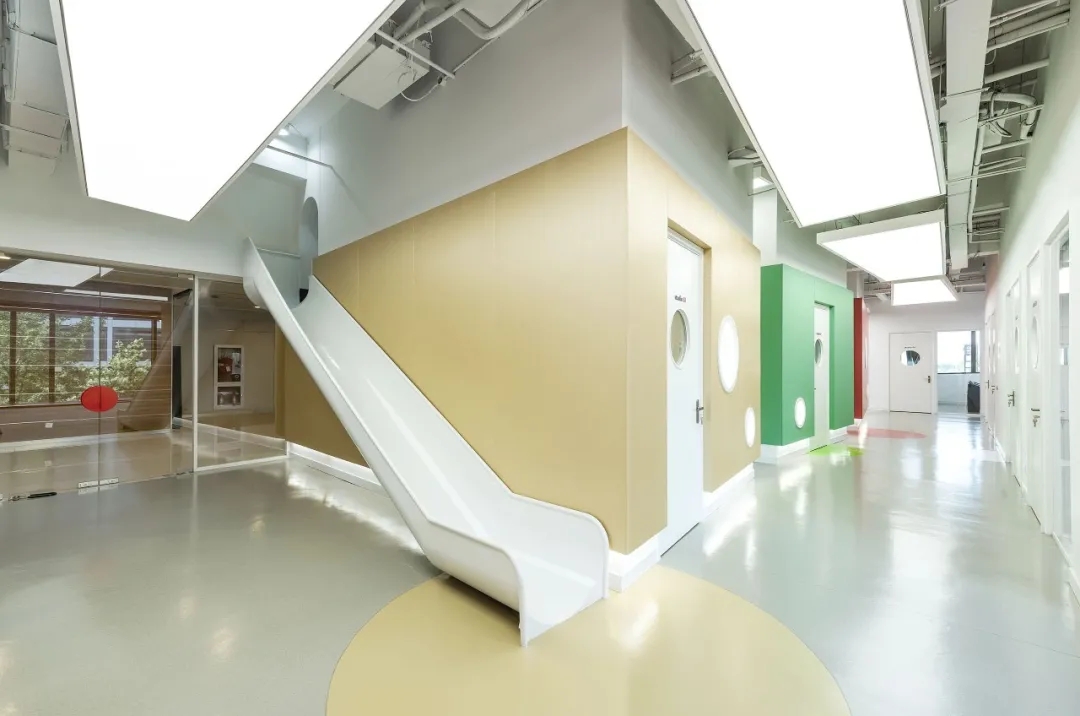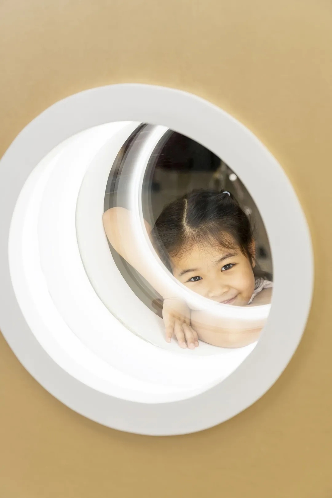 同滑梯一样,墙体开放的圆形窗口也是熠馨音乐艺术中心的标志性设计。对应儿童躬身、直身高度的圆形窗口与入口处三个彩色立面上开辟的不同形状的窗口一起,连通中心内外的世界,消解了由墙体打断的边界。