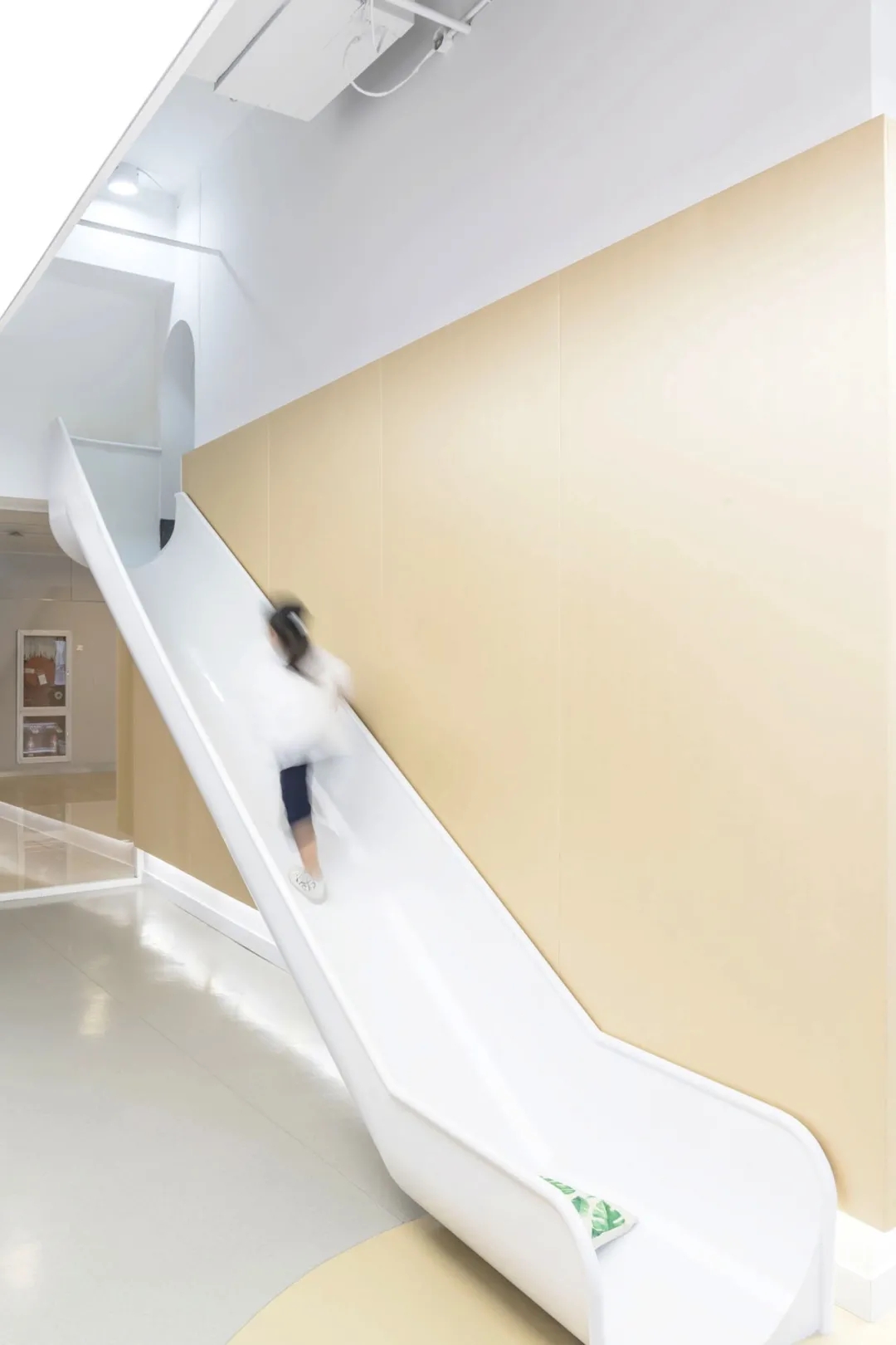 在场地有限的层高空间中设计一条可以让儿童穿行的夹层通道,贯穿金色盒子的另一端则是滑梯,沿着灯光指引,拾阶而上,尔后快乐的天性便在这一次短途冒险中释放而出。