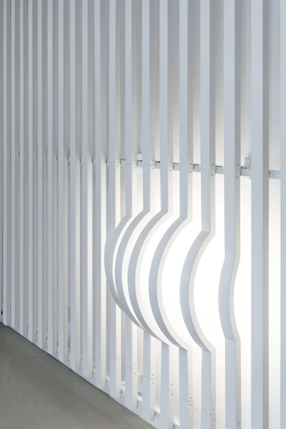 走廊尽头,打击乐教室与多功能排演厅各位于两侧。作为中心最为宽敞的空间,排演厅拥有整面的景观落地窗。不需过多的设计,仅以白色为底,栅格里面从墙面向屋顶铺展开来,点状与点状灯光点缀其中,并在随光源设计凸起的单元,简洁之中又有变奏。