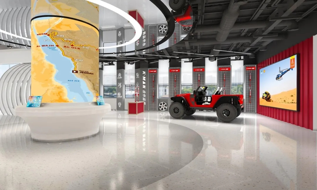01 情景张力 作为赛事标志,赛道越野元素是从头到尾贯穿始终,就像展厅里的企业文化展示,根据动线,穿插在了各个环节。时间轴和框架结合,有条不紊,更有无限生命张力。
