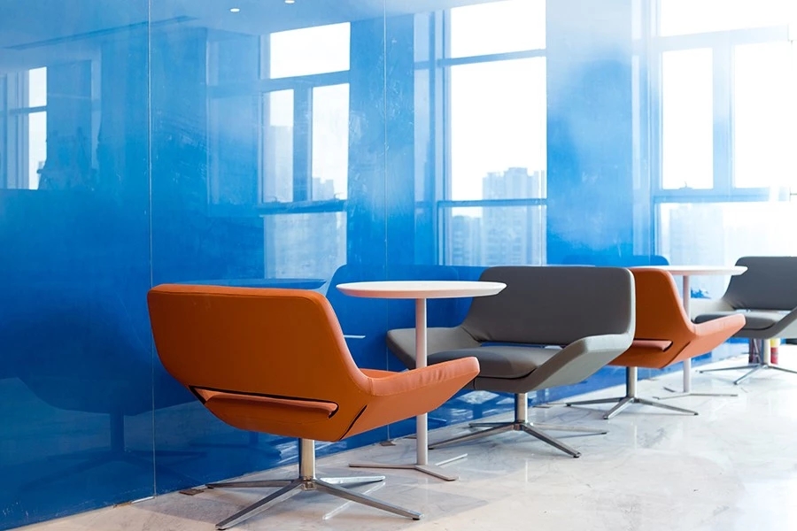 室内普遍采用了较为中性的色调,使得接待处蓝色的水磨石和粉色马来漆装饰的楼梯结构格外醒目。除此之外,互动区域的座椅,坐垫,灯具等都搭配了强烈的色调来平衡整体的设计。