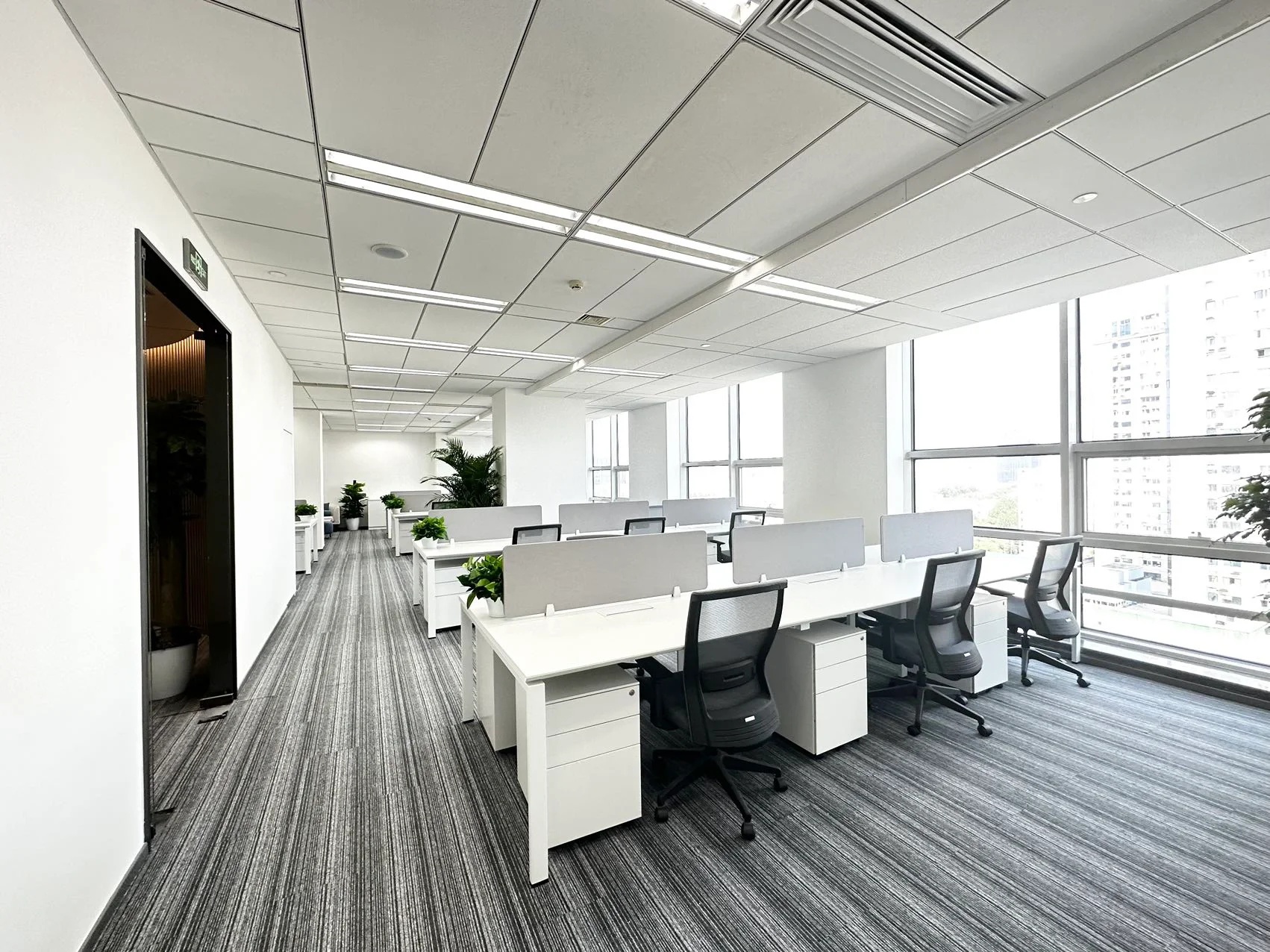 在挑高的天花板空间,办公室还设计了“空中花园”。添入不同种类的悬挂类绿色植物和热带盆栽,迸发出生机勃勃的活力,不但可以净化空气改善室内坏境,也让空中花园给办公室带来一股清新、愉快的自然氛围。