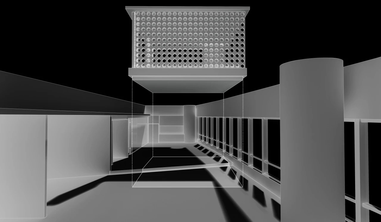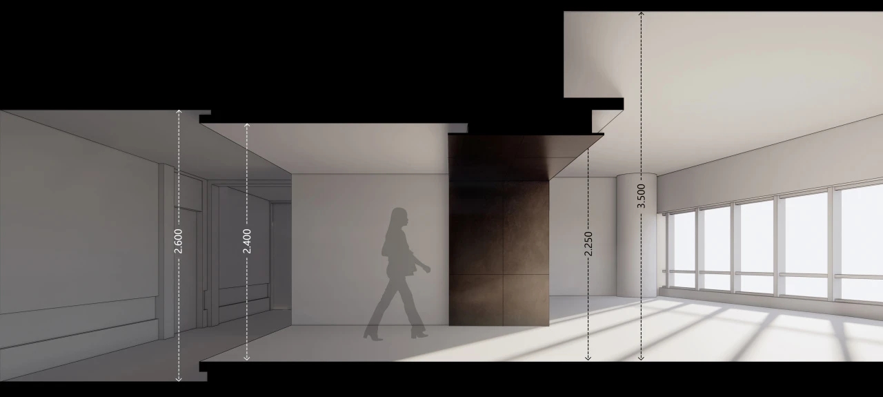 一个出色的空间应该是能够容纳多个时间并存的状态。因此,我们选择了最为纯粹的空间形式——“盒子”来作为新建筑外观的基本形态。这个巨大的集装箱仿佛嵌入到母体建筑中,以厚重的白色混凝土质感,营造出既新颖又陈旧的视觉效果,与周围环境更加融洽。在进入“盒子”的过程中,我们利用尺度的变化和材料的转换来建立空间的“挤压感”。通过轻与重、直与曲、黑与白等矛盾元素的对比放大,创造冲突和戏剧性,从而提升空间的表现张力。