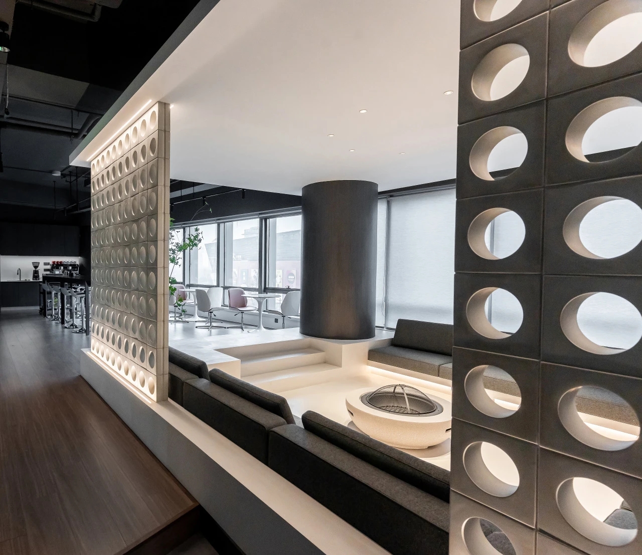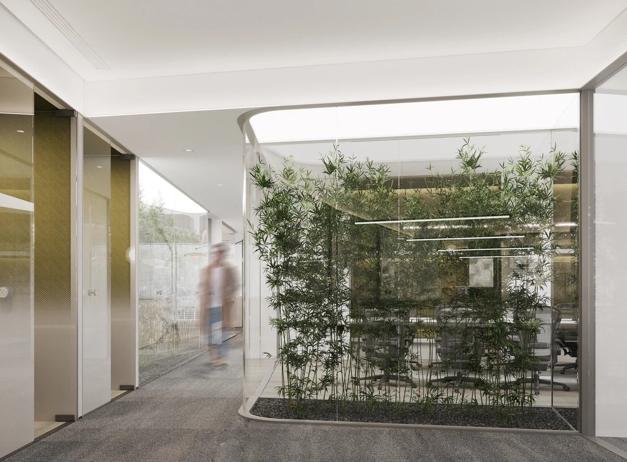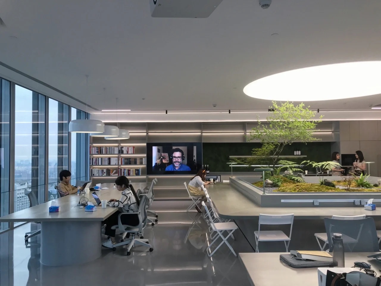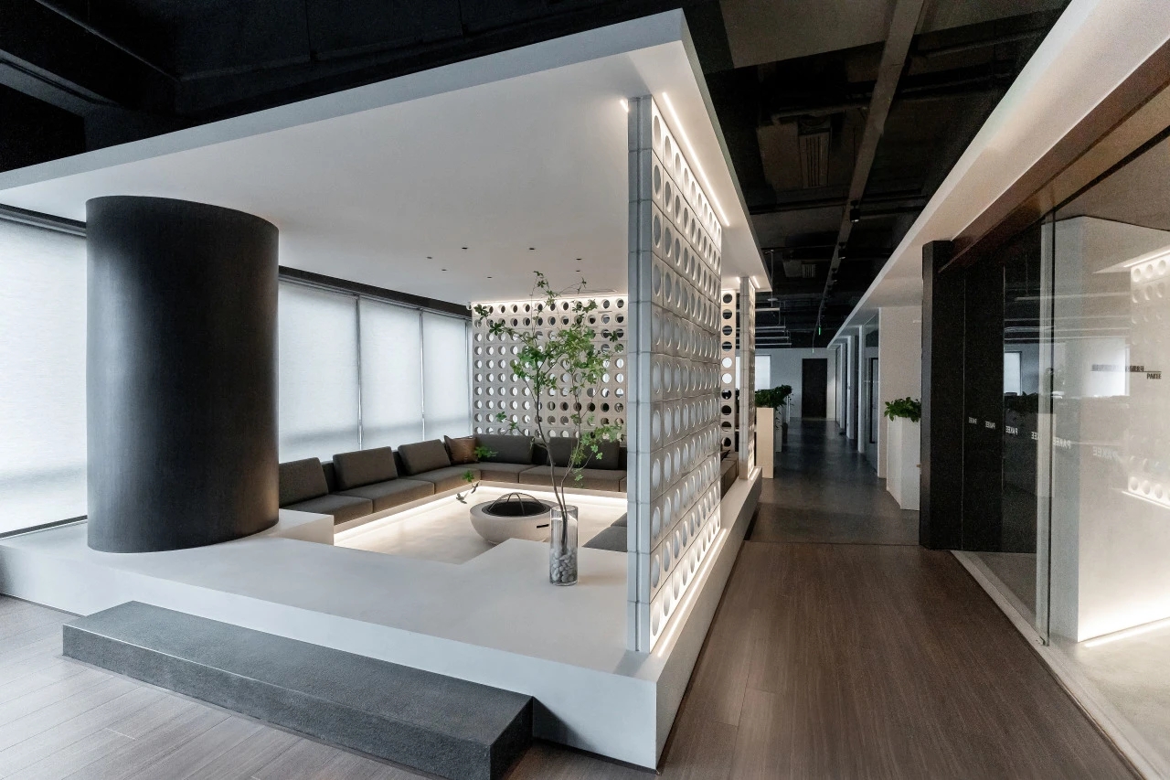 “室中室”概念这种构成方法实现了从功能到形式的一气呵成,且在不同的角度可以带来不同的空间感受。有机的环境和氛围让空间与时间越来越融合在一起。空间的魅力不仅仅在于外表的华丽,更在于与人相拥的紧密度,员工办公区与休闲区的比例为1:0.75,这代表富余的活动空可自由切换不同的状态,实现工作与放松间更好的平衡。大会议室位于休闲区北侧的巨型玻璃匣子内,充分利用了南面的绝佳采光,同时保留了一定的隐私性。