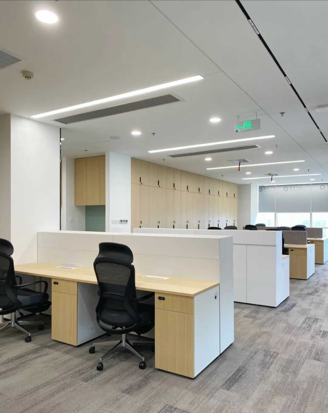 办公区的设计简洁而不失多元性,其顶面以“模型”为灵感,巧妙地呈现为一个可拆卸的模具形态。石膏板吊顶作为模型的内部结构,外部边缘则以灯光带进行封边,精致的细节处理让办公区的装饰价值倍增,充分展现了独特的办公风格宣言。背景墙与办公桌挡板的色调均取自携程的企业色,蓝色挡板与墙面色彩保持一致,旨在打造出纯粹而有序的办公空间。