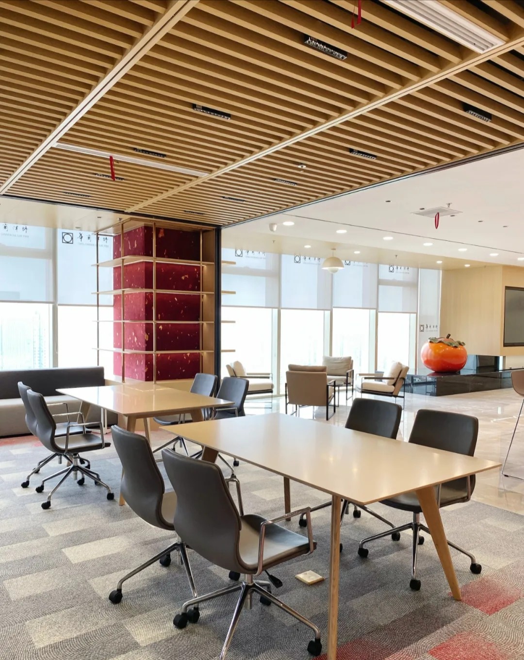 我们的设计理念是将"热情款待"与"工作"相融合 — 这一理念不仅从酒店行业中获取美学创意,还从酒店行业提供的体验中汲取灵感。在美学方面,我们利用了建筑风格,打造了平静舒缓、简约的外观等元素,而在体验方面,我们的设计侧重于让人一进门就能感受到宏伟的到访体验,并提供多样化的空间选择。