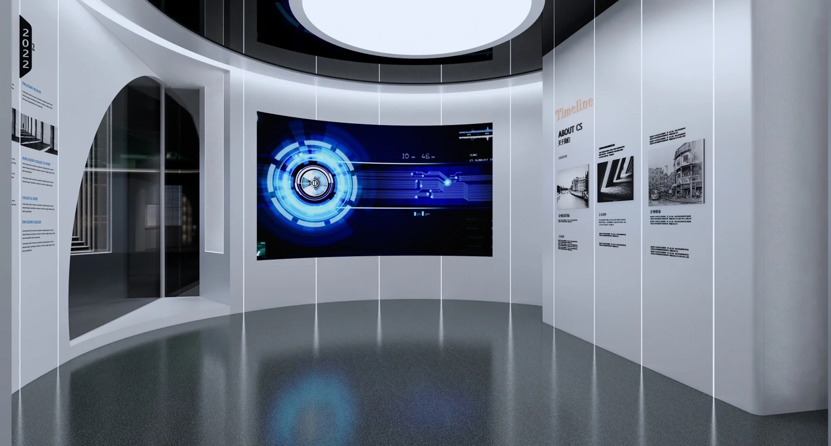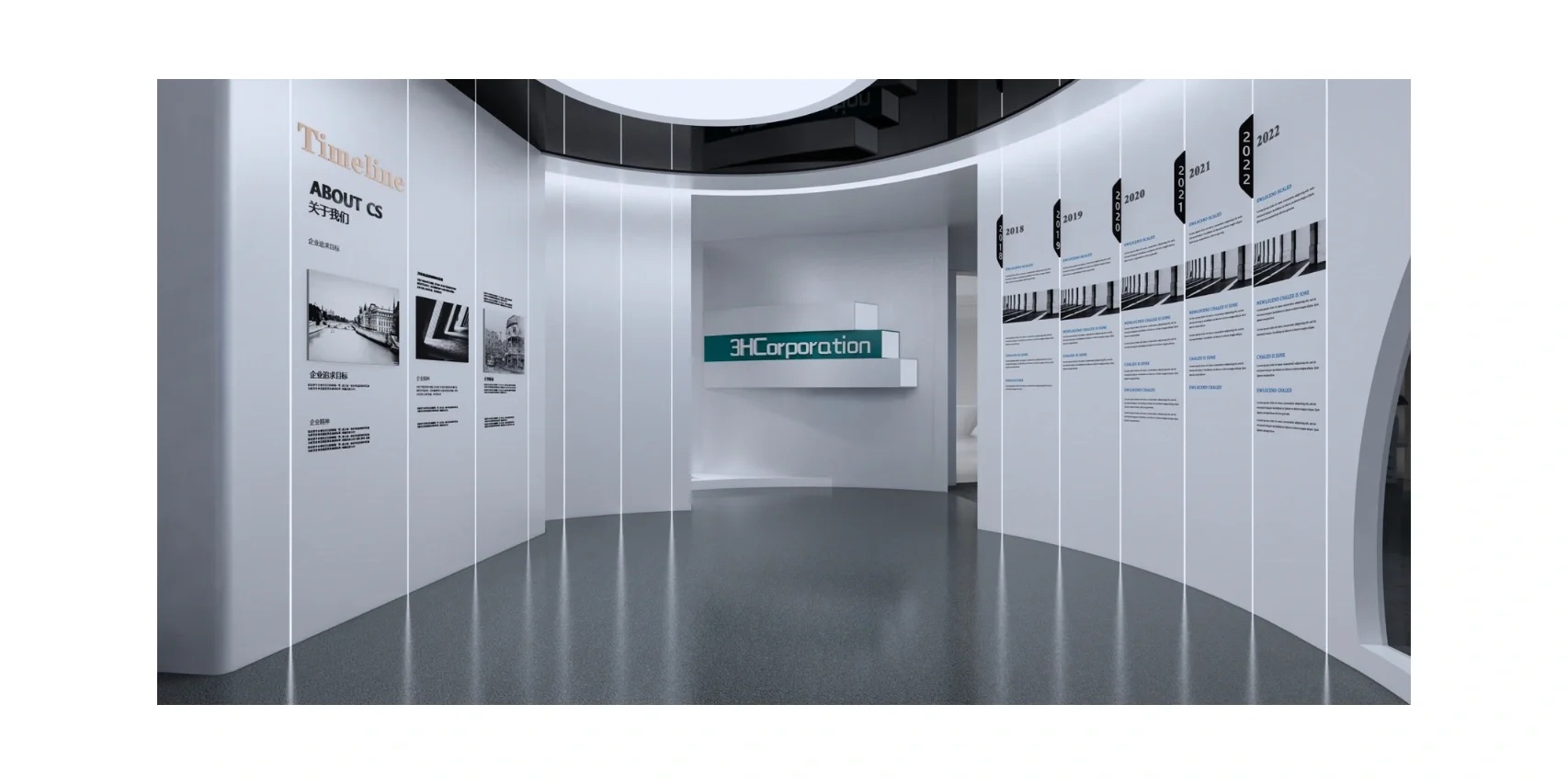 简约的白色与灰色,结合光的质感有机地融合在空间里。空间设计整体简约现代,富有序列感,分区层次鲜明,设计了不同的阅览方式,与图形相互补充,不会分散对信息的注意力。整体流畅连贯,通透开放,自由流动的氛围为空间性格奠定了基础,空间色调上逐步提亮,并延续顶部发光膜,代表着企业精神的延续。