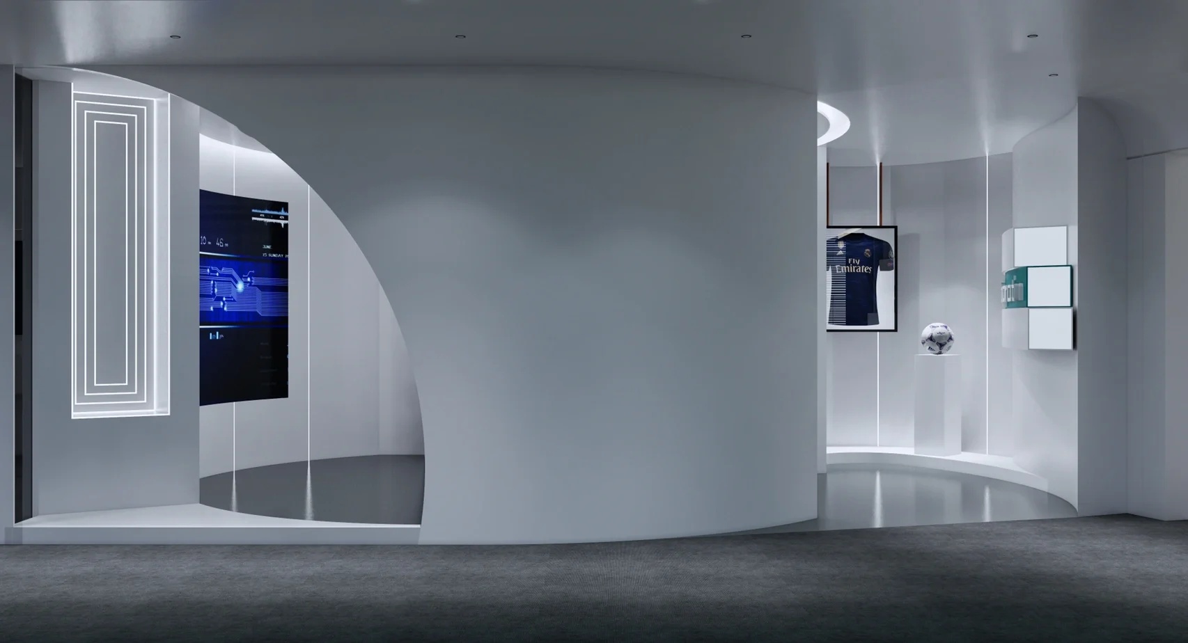 在多功能室中,致力于全面打造富有科技感的现代展厅,营造一种极致的沉浸式体验。赋予空间艺术性和未来感。我们希望通过不同的空间形式或使用方式来营造一种比较有趣、随性、舒适及放松的会议空间氛围。活动桌椅可以灵活摆放,不拘泥于一种形式,满足不同的会议与活动功能需求。用线型灯分割,在视觉上使空间开阔、延伸。