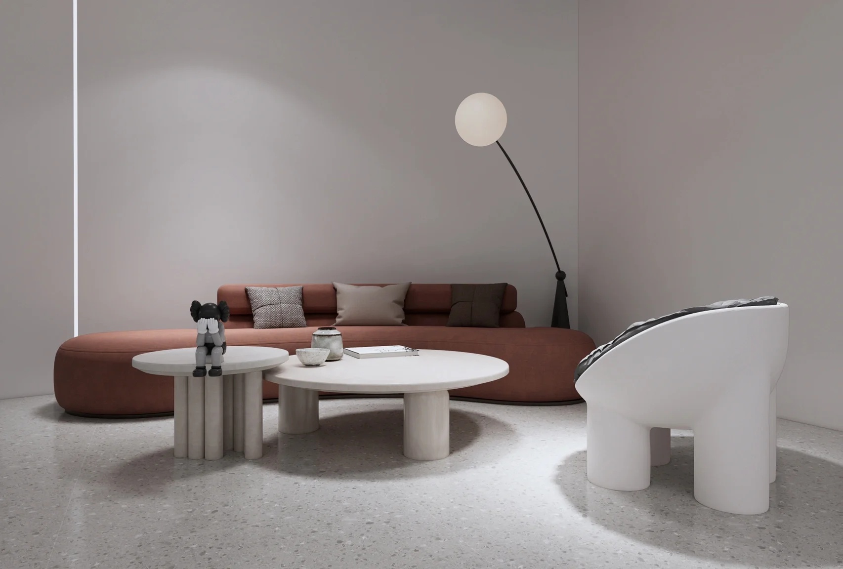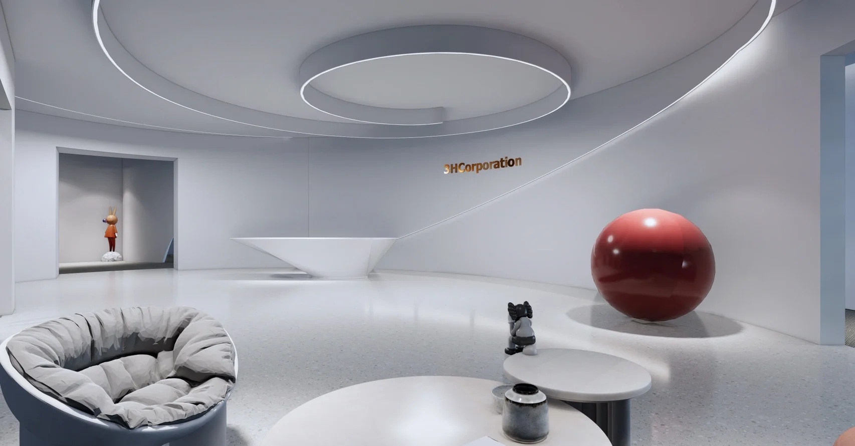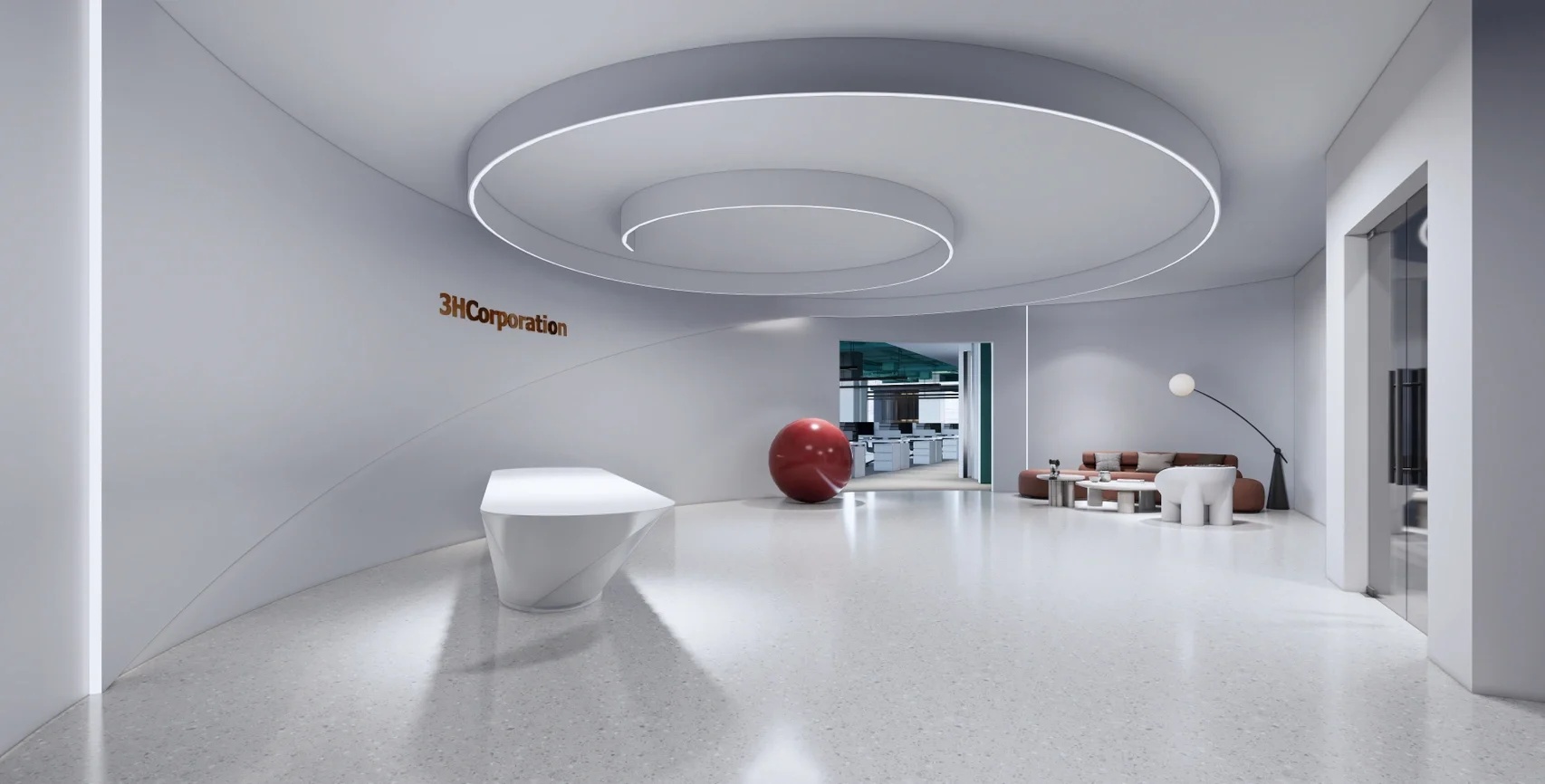 直线的行为准则是流动空间的设计量尺,柔和的曲线审美,在流动空间下表现得异常契合。 作为进入办公空间的第一印象,投射出艺术形式的科技感同时,前台整个区域的造型以及等候区的家具和摆件等软装搭配,都以活泼的曲线象征延续和无限可能,为空间增添趣味的同时也丰富了空间的情绪。
