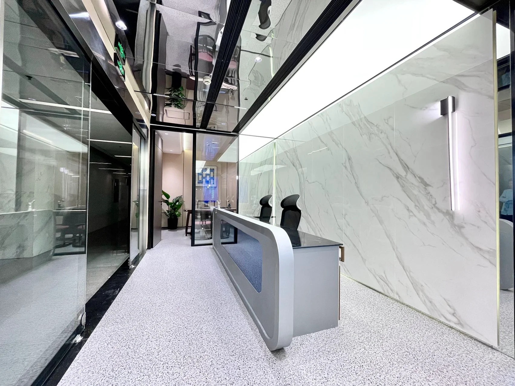 “T-Hub”SUTPC是以交通规划和研究为其主要的业务服务,为城市提供交通整体解决方案,总部具有较强的对外性和展示需求。10楼的入口大堂需在小小的空间内准确的表达其业务特征及文化理念,我们联想日常生活中交通与时间性、以及位移变化的动态关系,将其抽象化为“T-Hub”,T代表Transportation 和The One, Hub代表核心、中心,在文字上寓意其在交通研究行业中具有相对唯一性的领军地位。在空间上,通过大堂空间比例、墙地顶线性元素、前台处理等进一步阐述被抽象化了的动态印象。
