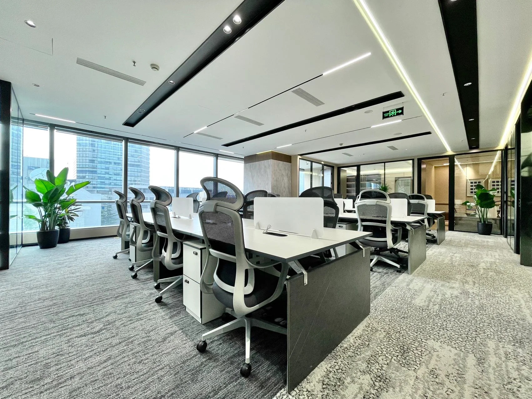 阳光透过百叶窗造访空间,轻柔静谧,在窗边坐卧一时,心情舒畅,自然又清爽。敞开办公区充分拥抱开放式布局最小隔断的使用,充分利用建筑本身的采光优势。沿窗设置单人通道,提高办公效率的同时亦避免日光直射,从细节处体现出企业对员工身心健康的关怀。黑色和白色的搭配给整个空间赋予了严谨的氛围,绿色的加入却也充满了现代化的气息,简洁干净,兼具个性与实用性,为一天至少工作8小时的员工提供了一个舒适、方便、高效的工作环境。