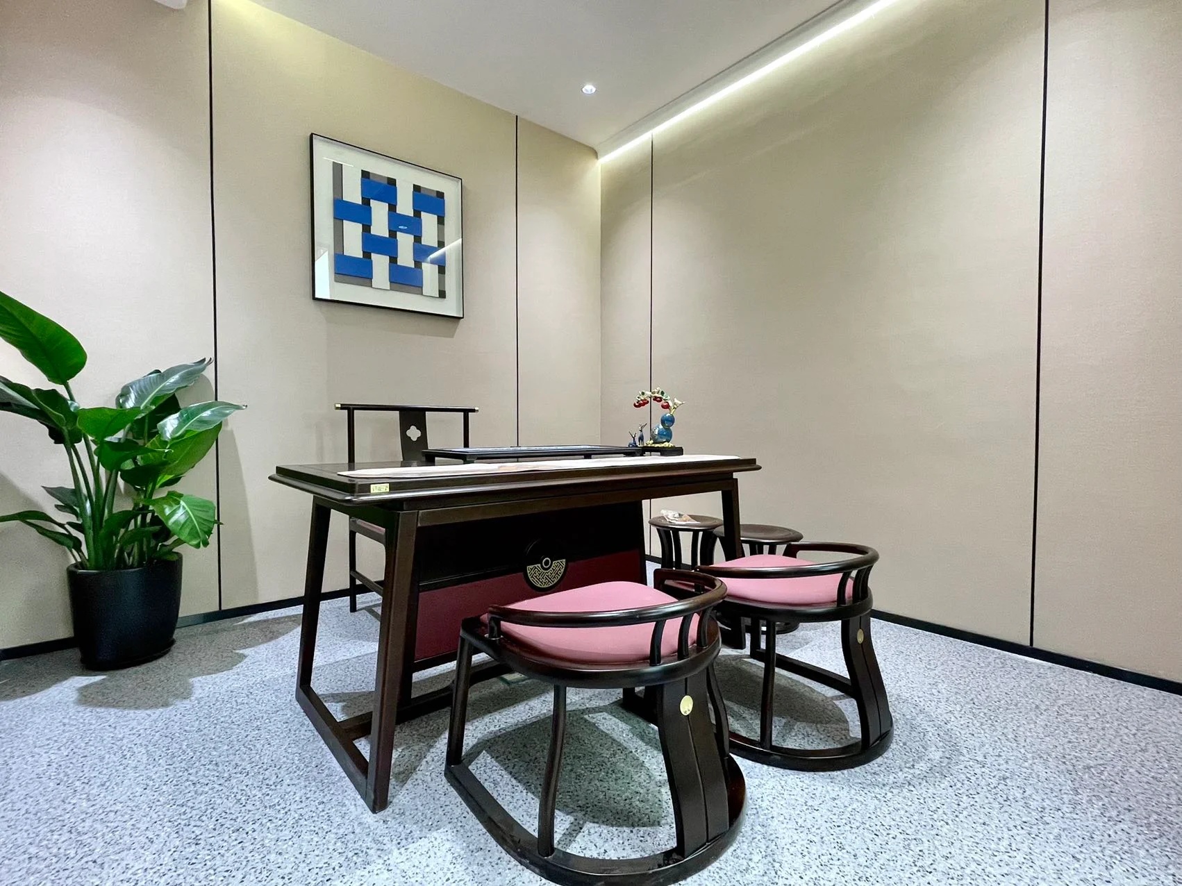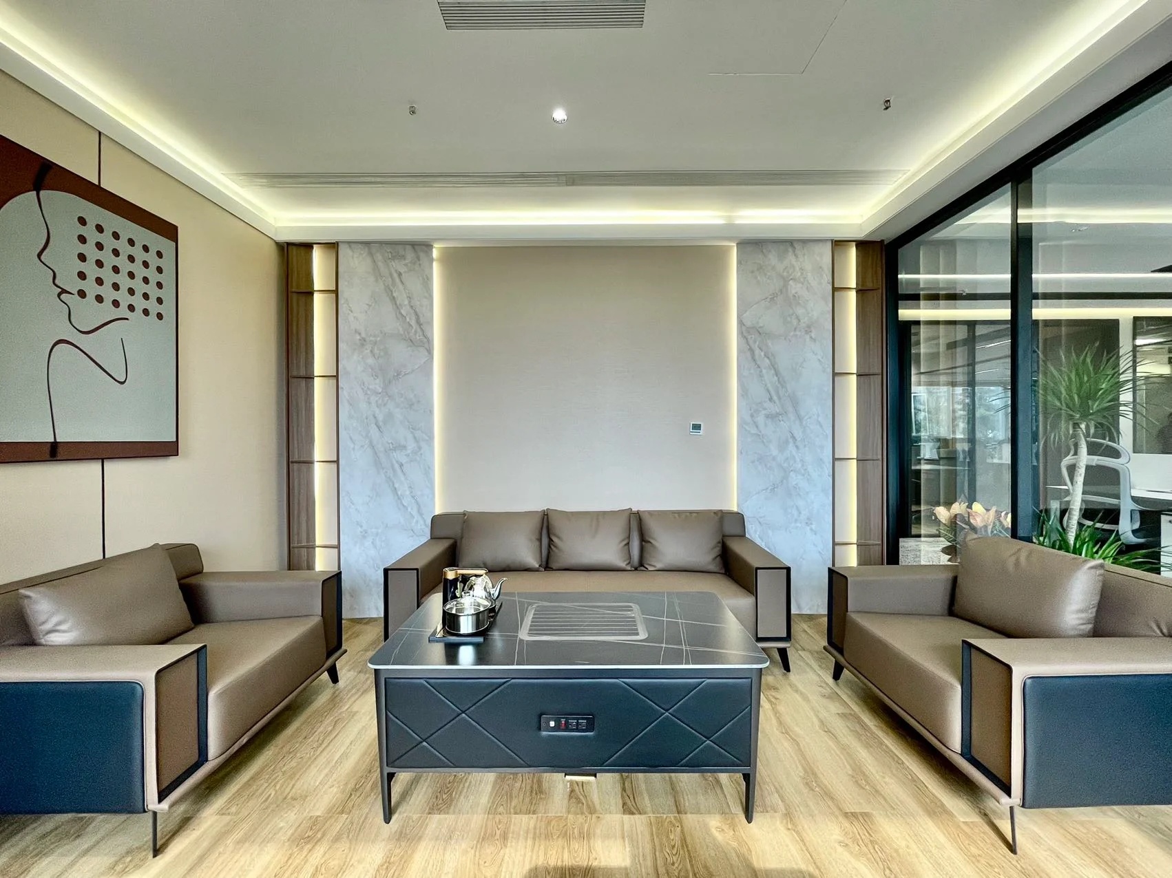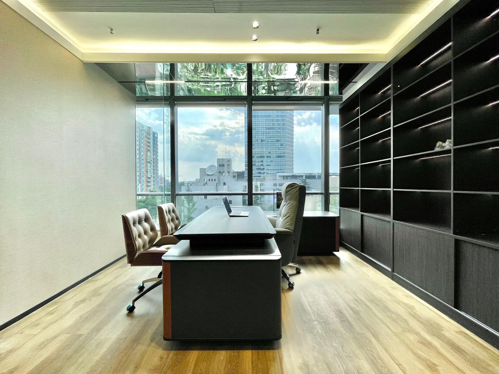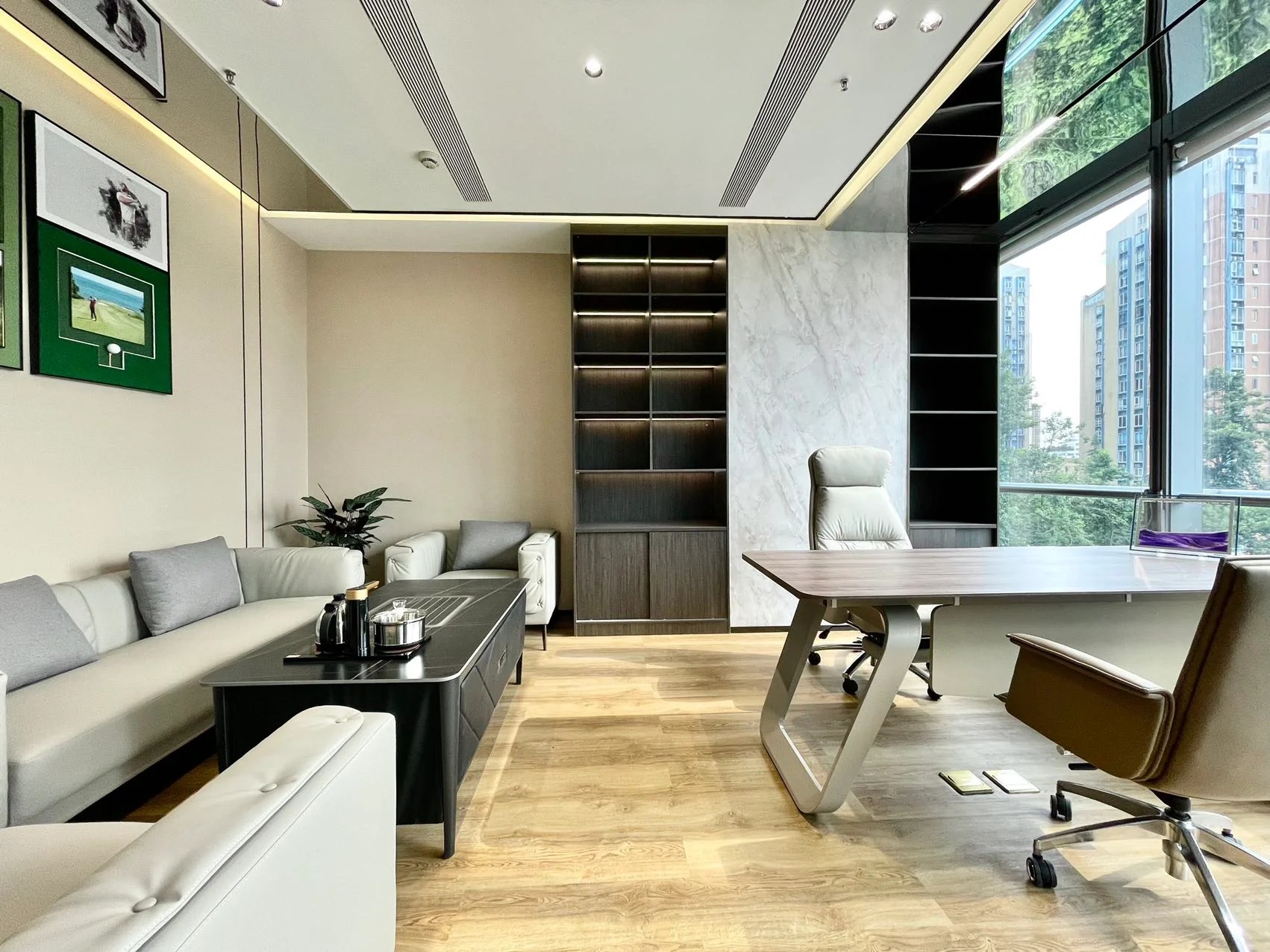 总裁办公家具使用的大体量家具,给人以沉稳、大气的感觉;而会客区的浅色沙发搭配圆形茶几和亮色座椅,又为整个空间注入了一份轻松惬意的氛围。背后一体柜设计,兼具储物、展示、装饰的作用,且与墙面、地面色系相近,更显整齐。紧靠着的百叶窗,坐在窗边能够自由地感受微风拂面,阳光不燥的时候取两本书翻阅,一定是在紧张的工作之外最舒适的精神享受。