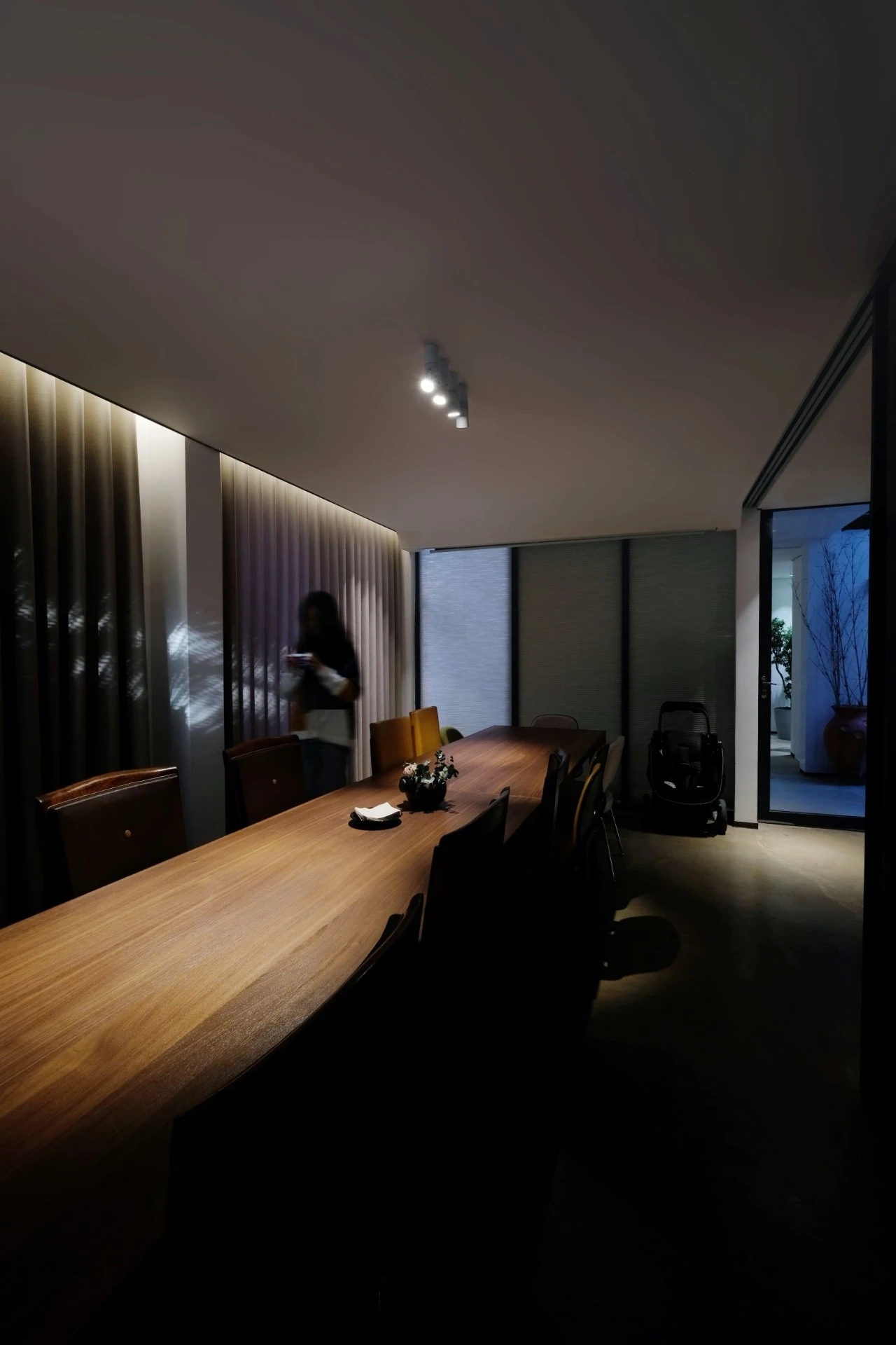 与茶室比邻的区域,我们做了一个餐厅区。这里有我们自主研发的“缘桌”,平时,同事时常在这里就餐。有时也会作为招待我们的朋友、业主的空间。我们在这里渡过很多个难忘的夜晚。