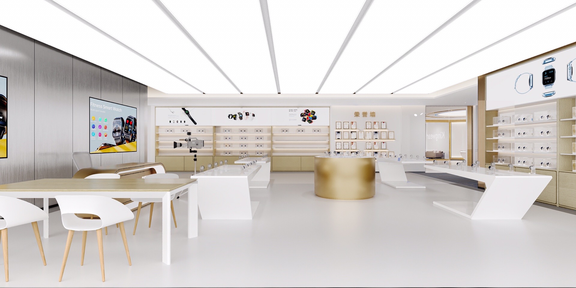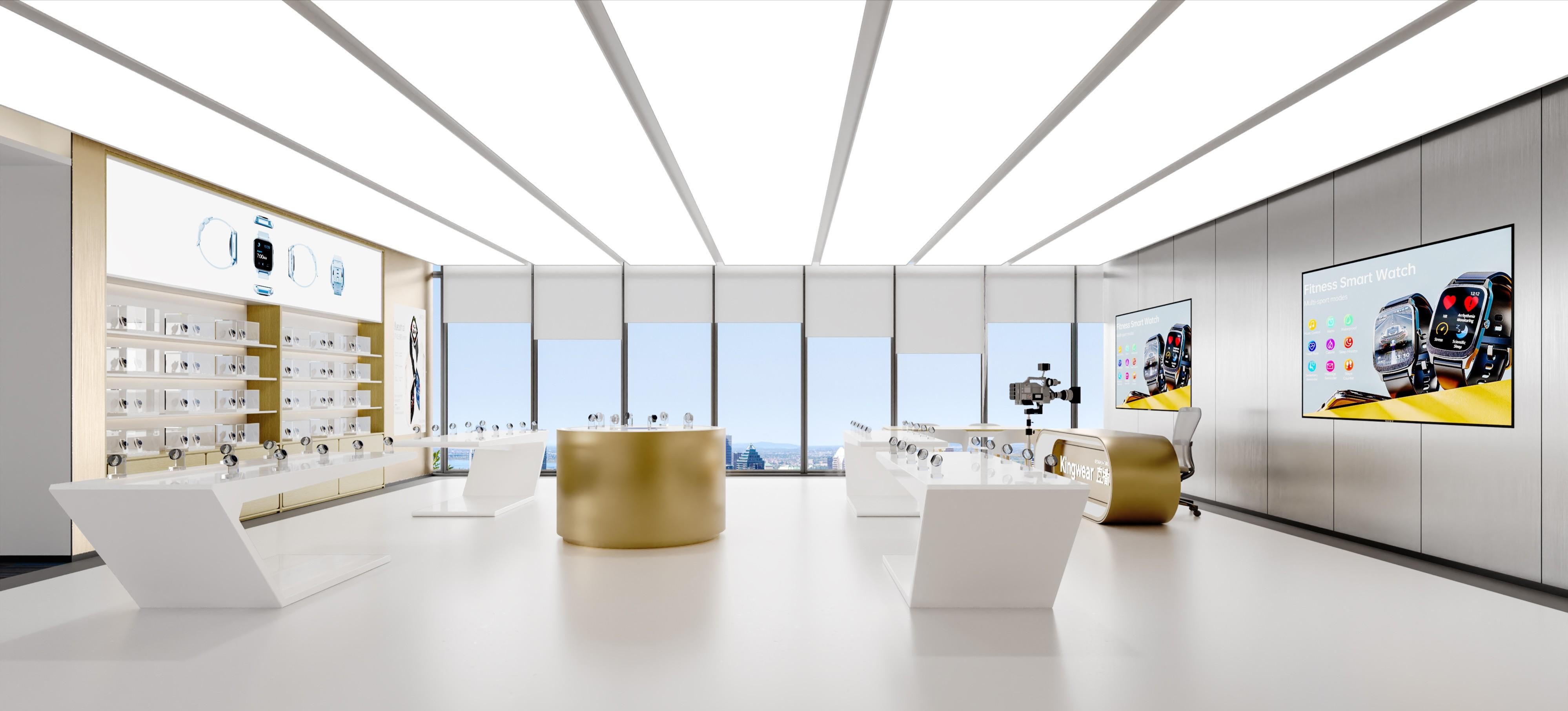 展厅的设计充分体现琦沃科技在智能穿戴设备领域的专业与实力。整体布局清晰明了,白色与原木色的搭配营造出洁净、高雅的空间氛围。暖白色的灯光为产品赋予高贵而温暖的光环,使展厅既实用又富有美感。