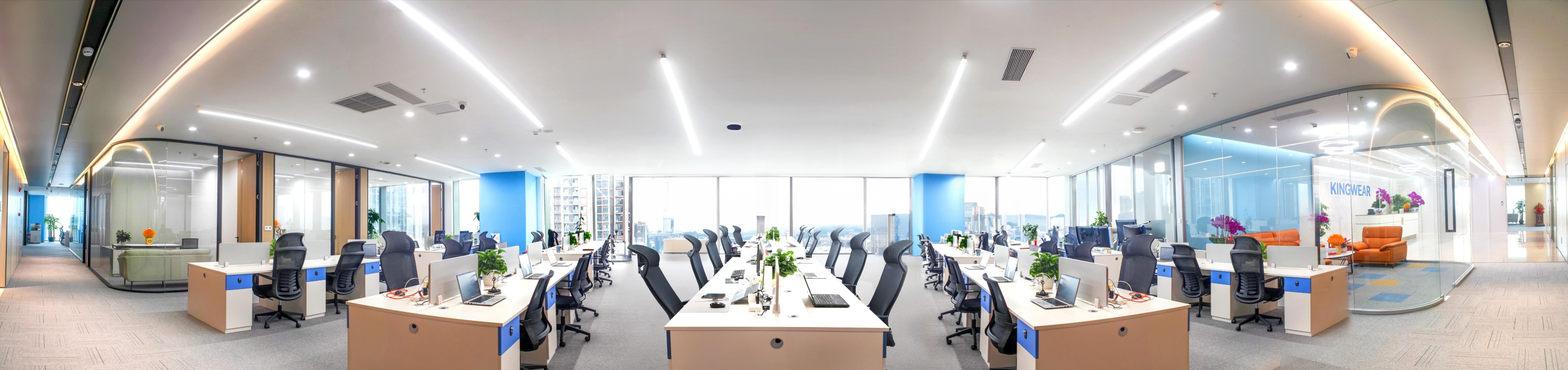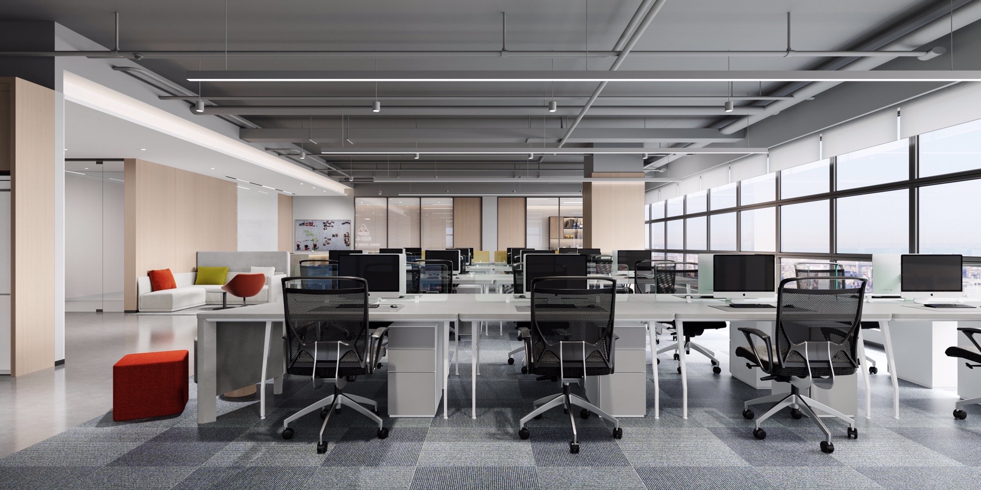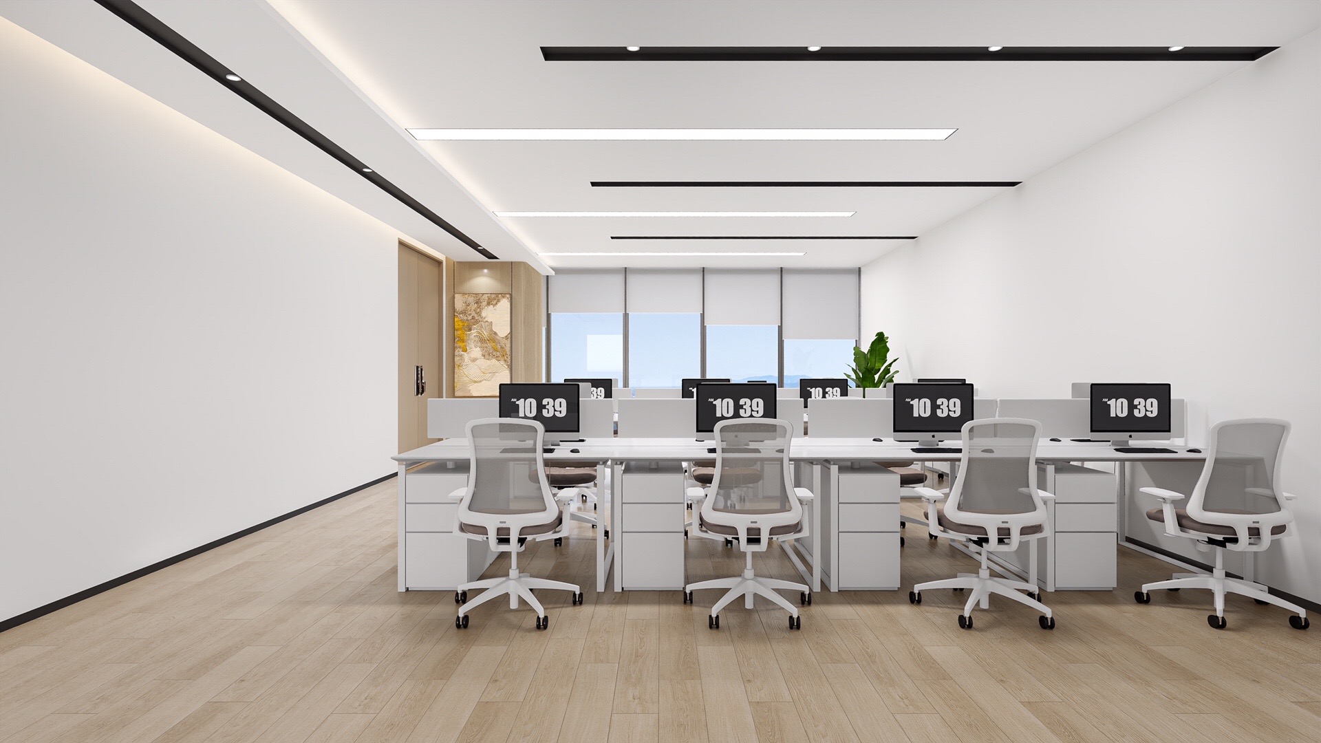 公共办公区秉持现代简约主义设计理念,采用宽敞通透的大开间布局,线条流畅,色彩搭配和谐。蓝色与白色、灰色巧妙地相融合,既展现沉稳大方的质感,又彰显时尚活力的氛围。