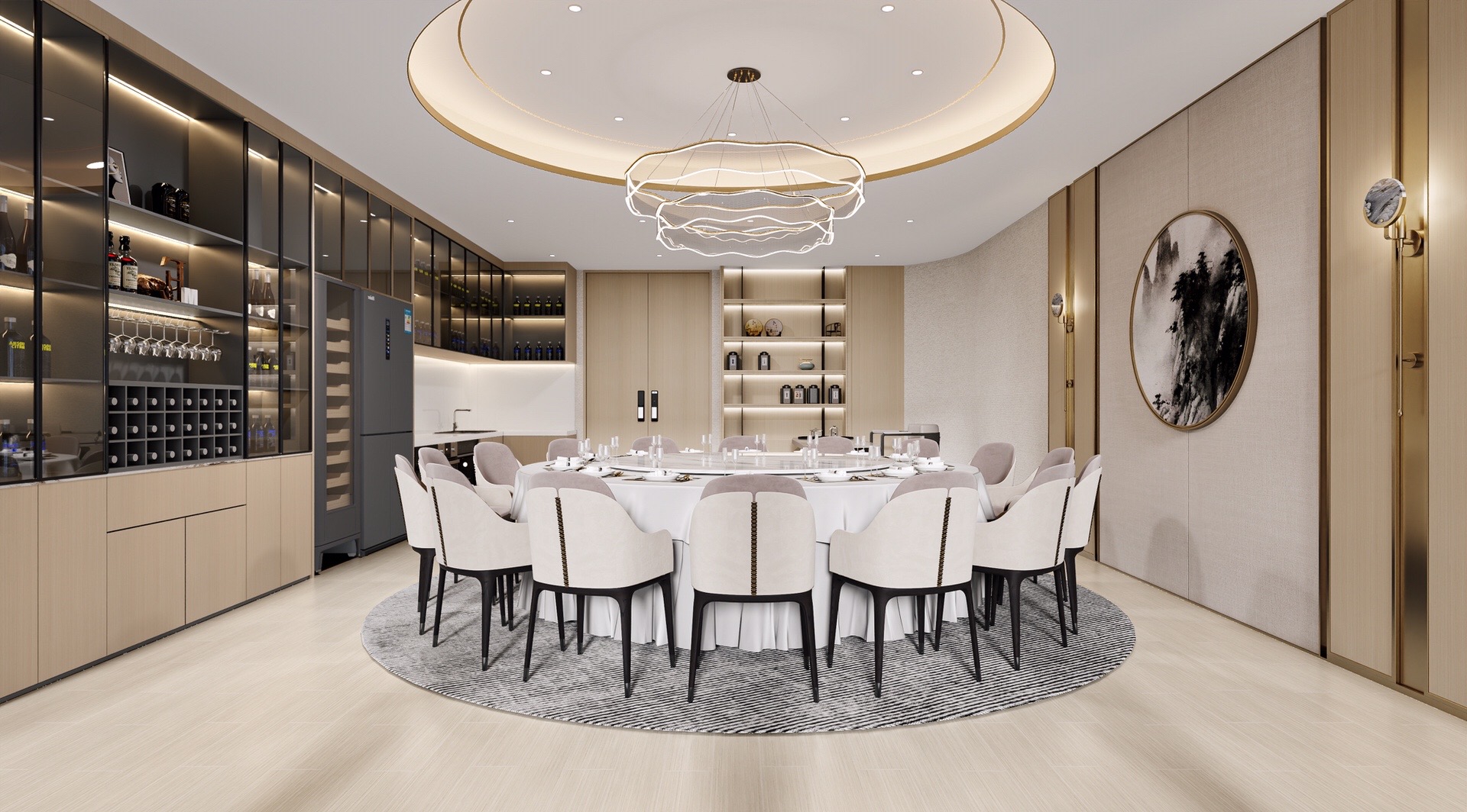 为满足客户对展示人物数量的存储需求,在入口和餐具室之间设计了一个架空双面玻璃柜作为隔断功能,以划分空间并设置隐私。茶水间与同色调的家具和固定装置相匹配的整体美学,而沙发面对大窗户,让工作人员得到一个开球的时刻。在侧面,一些内置的展示架设计有灯槽作为装饰,与墙纸融为一体。