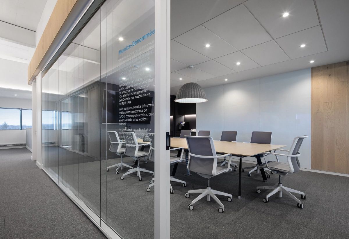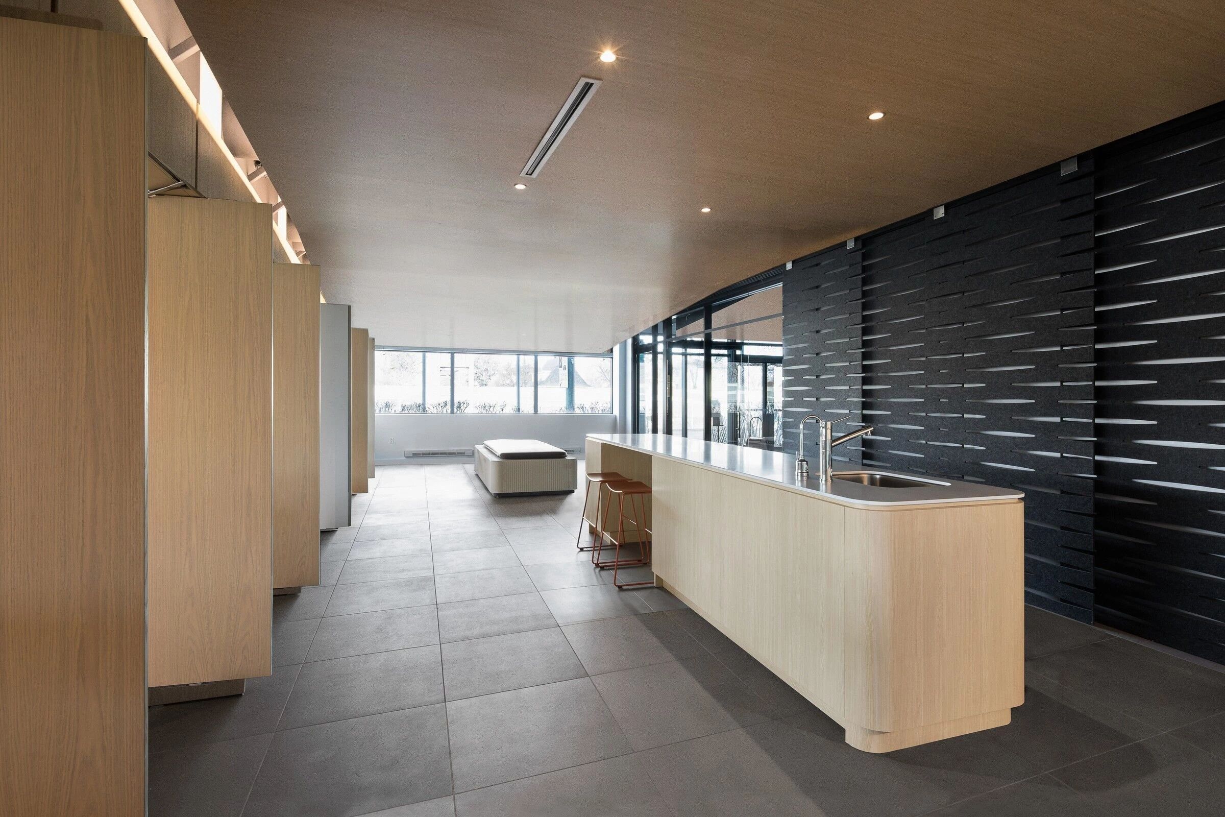 新环境的物质性表现在白色、灰色和大地色调的矿物调色板上。白色橡木在魁北克的大量使用,使其散发出一种柔和舒适的感觉,与家的温暖联系在一起。热轧钢的翡翠卷轴为这种体现强度和稳定性的当地材料带来纹理和深度。偶尔添加毛毡,以墙板或镂空的形式,有助于空间的视觉舒适性和声学效果。除了定义工作区域外,悬挂式吸音天花板还能带来平静和专注,而流通区域的裸露结构则唤起了建筑的原始一面。