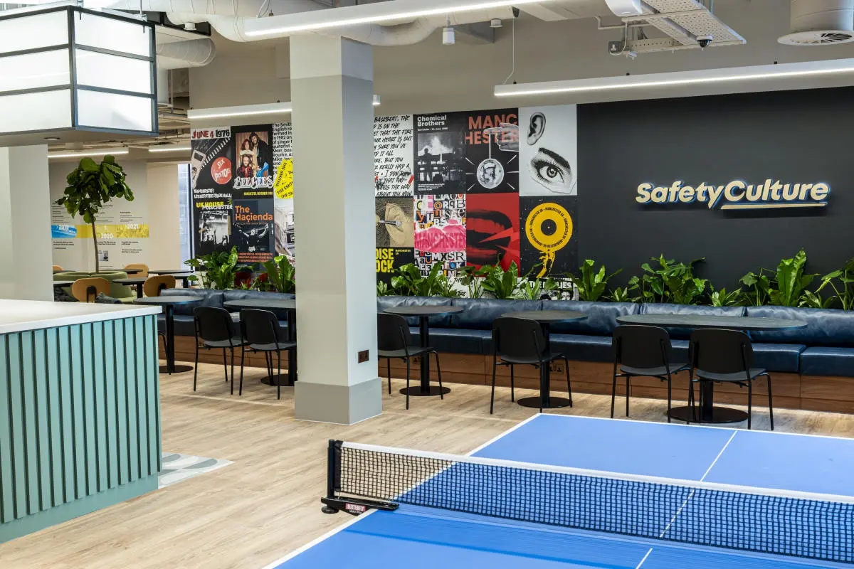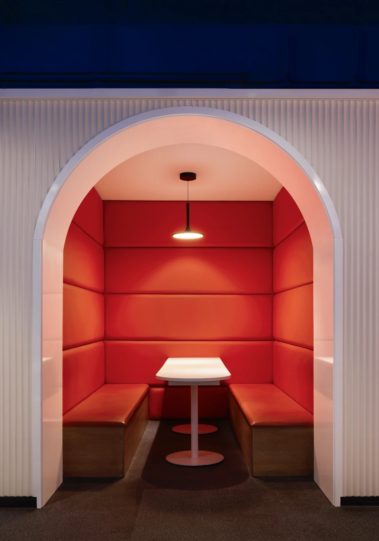 休闲区兼具休息、洽谈、放松身心的功能,橙与绿的撞色搭配,充满生机与活力。抬高阶梯的处理,为狭长的休闲区增加了立体使用的宽度。「众生礼佛」图默默地陪伴着大家,给予平和的爱与温暖。