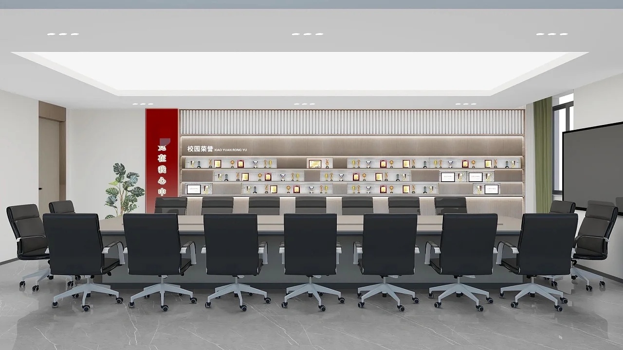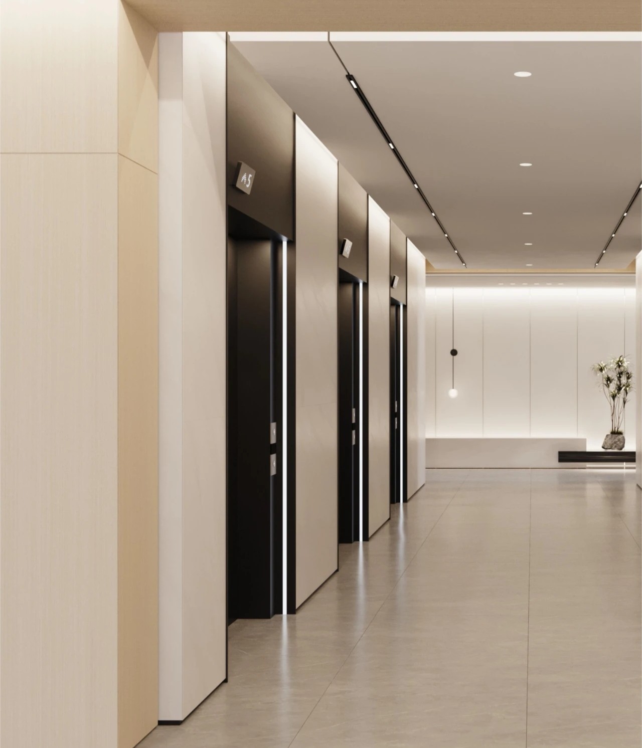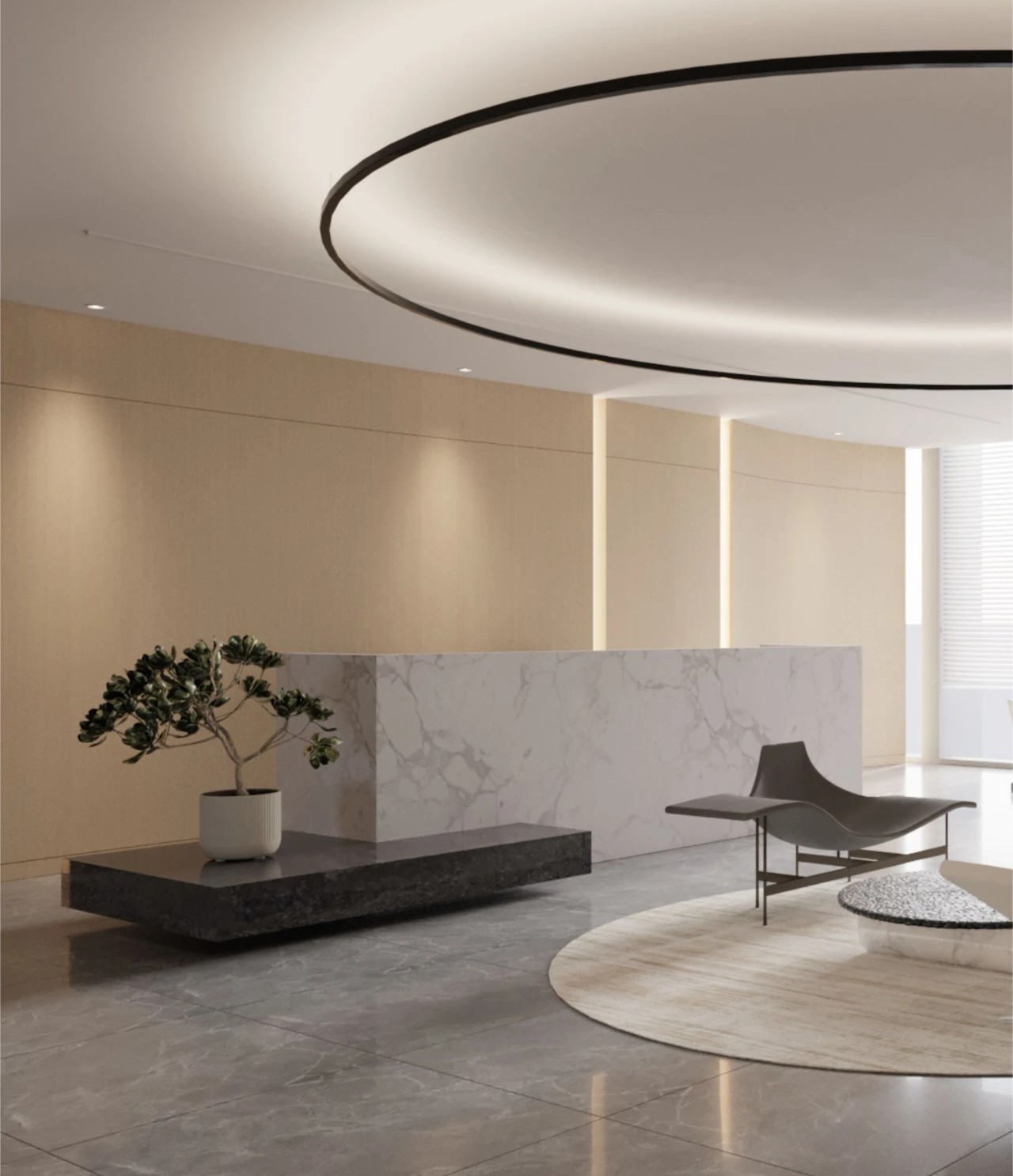 因应“天圆地方”的传统哲学,设计师在办公区域入口处设置了空间转折的节点,圆形的天花,弧形的屏幕,空间能量在这里缓缓地流向办公区。而视线则会被通道尽头的「玉兔奔月」所吸引。这是唯一的一幅,以艺术装置的形式设计制作的立体积木。平面的铺陈、立体的堆叠,体块、图案、层次、光影,成为幅难得一见的空间装置艺术。