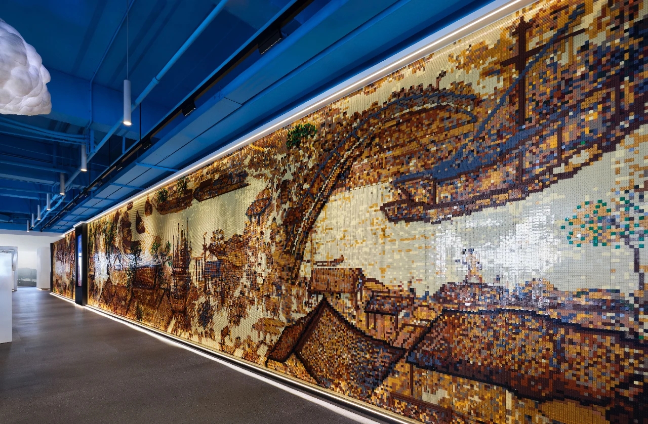 历史上最有市井生活气的,莫过于「清明上河图」了吧。因此,设计师让23米长的积木款清明上河图,穿越到公共办公区墙面上,与热闹的长沙城市精神呼应,让大家在工作中得到启示:努力工作的普通人将创造出伟大的盛世。