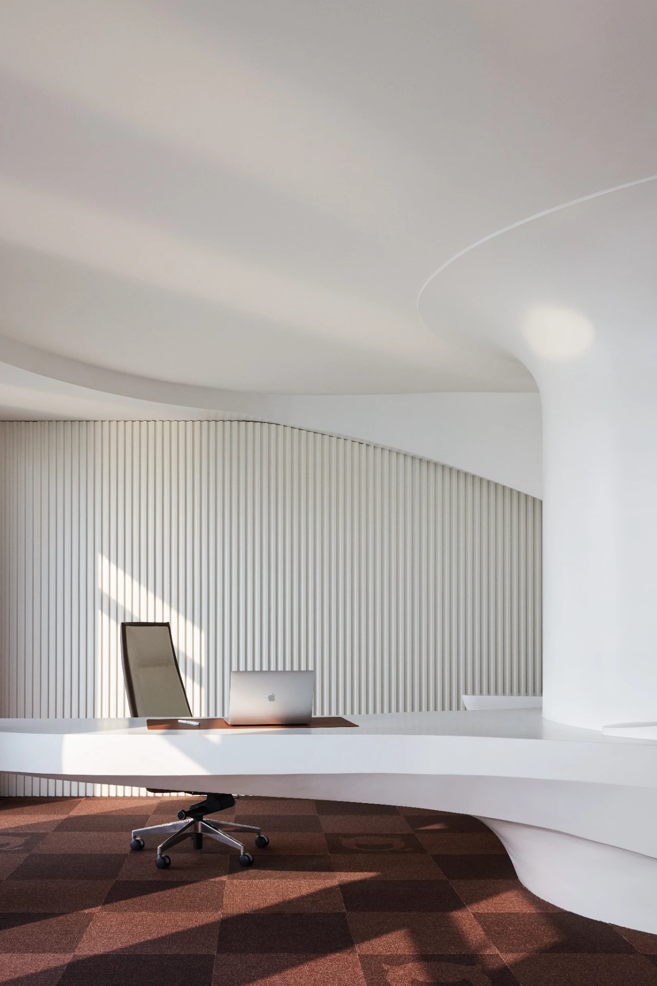 积木不仅是空间的亮点,也是动线的导引。玉兔奔月紧邻的,便是总裁办公室,拥有良好的采光和优美的室内风景。整体空间以白色为主,突出漆面光亮的质感,与窗外的自然景观相得益彰。宽大舒适的弧形沙发,显示主人的热情与亲切。