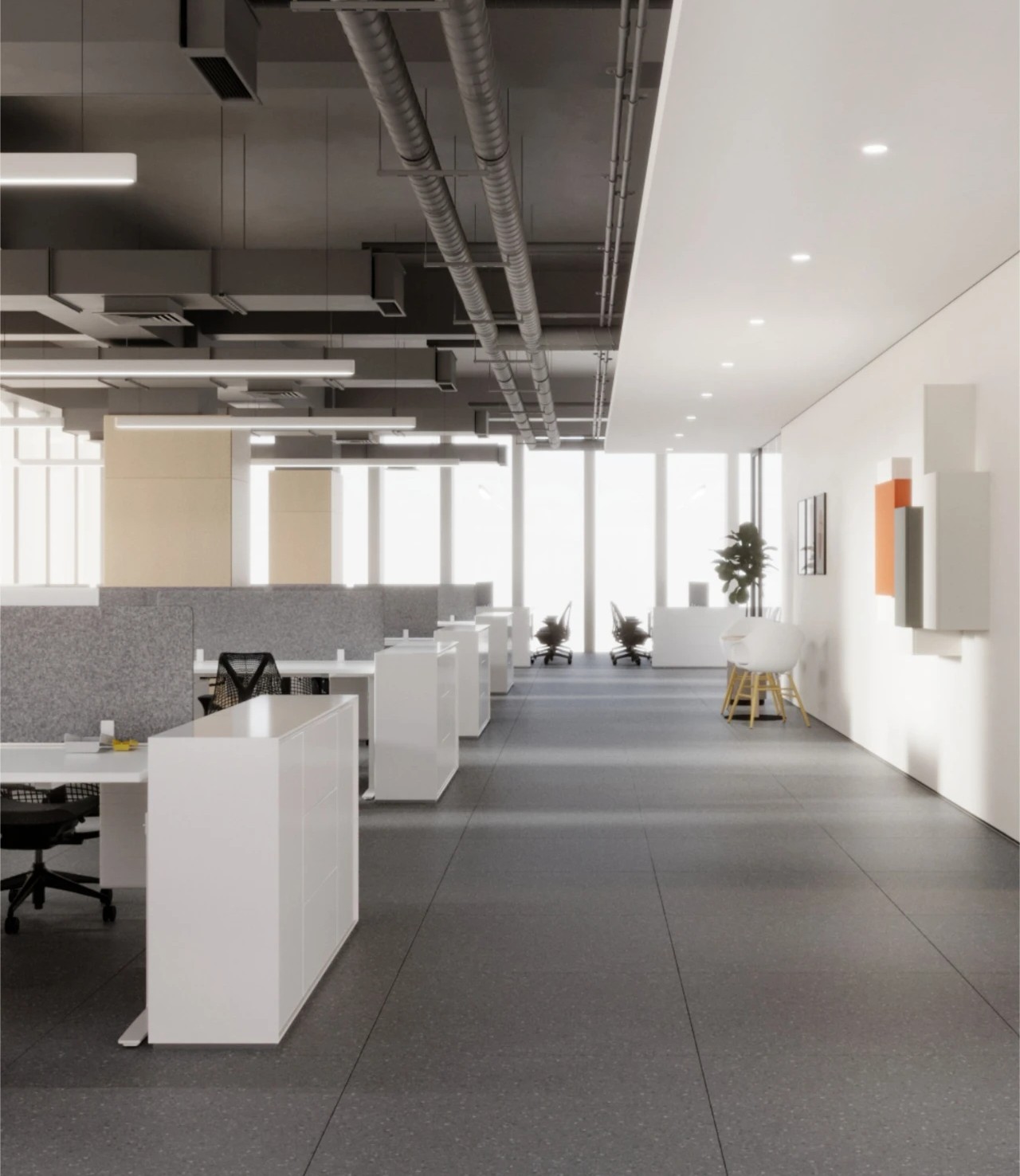 唯一不足的是有一个巨大的承重柱。设计师将这根柱子与办公台面巧妙融合,为空间增添了艺术趣味。