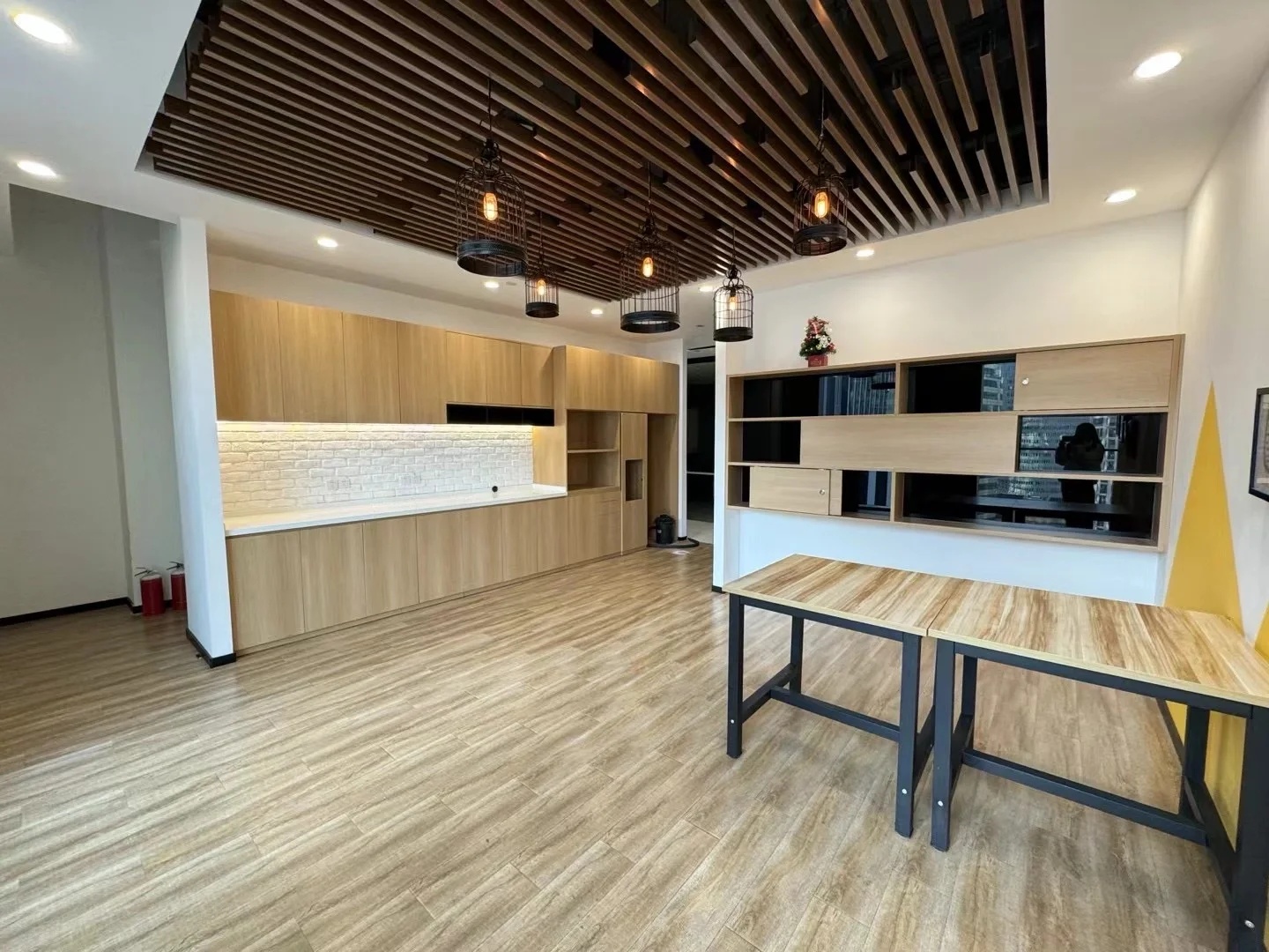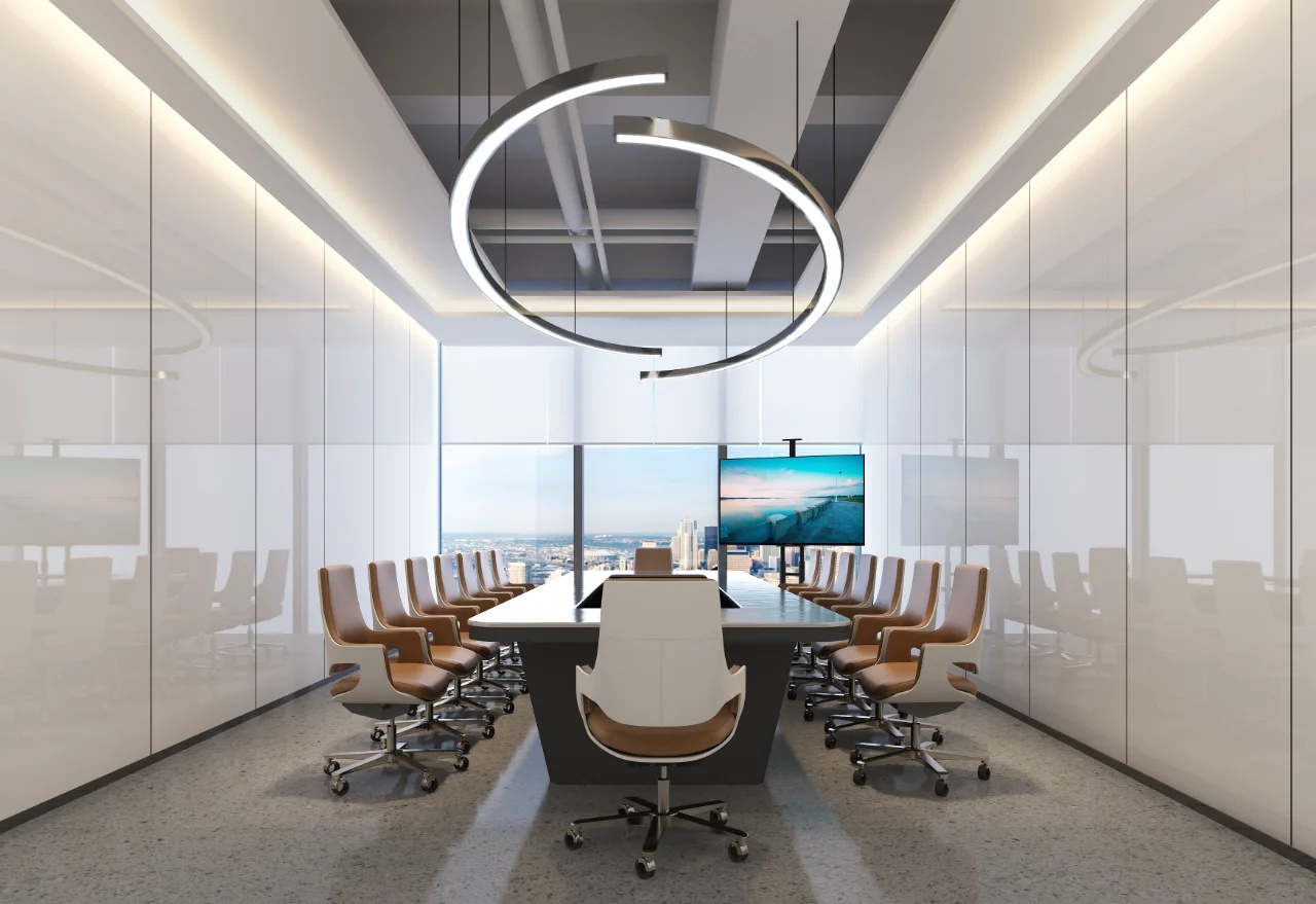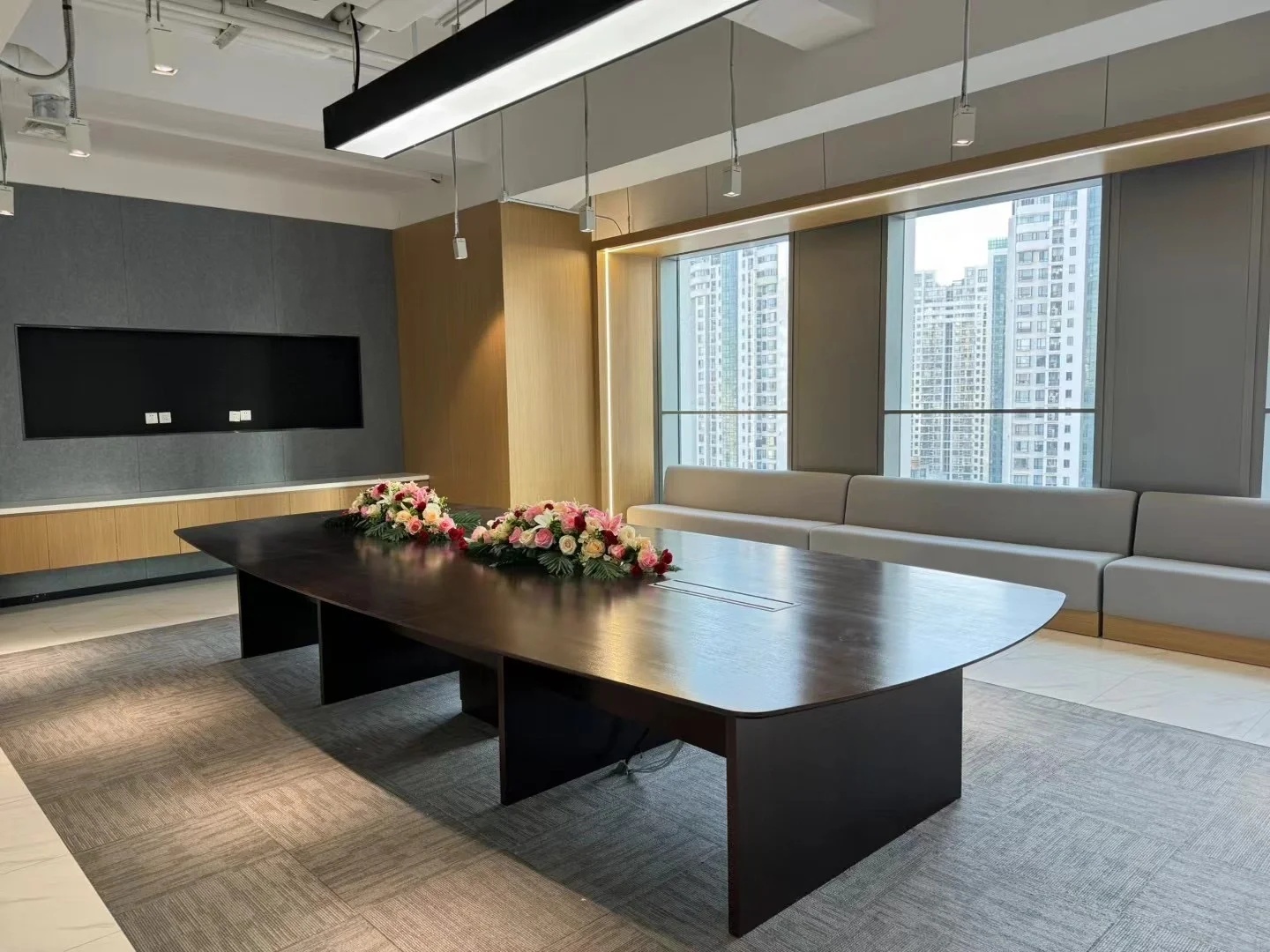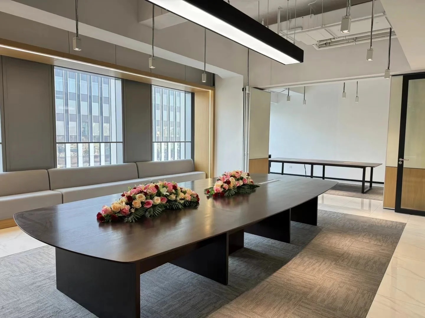 会议室的墙面大面积使用原木色的木饰面作为装饰,灯带的修饰,绿植的陪衬,营造出安闲,轻柔独具匠心的氛围感。