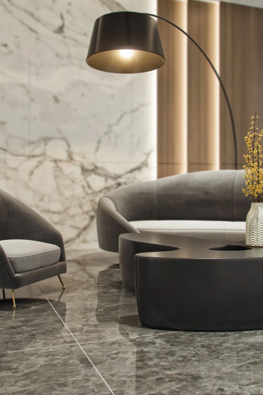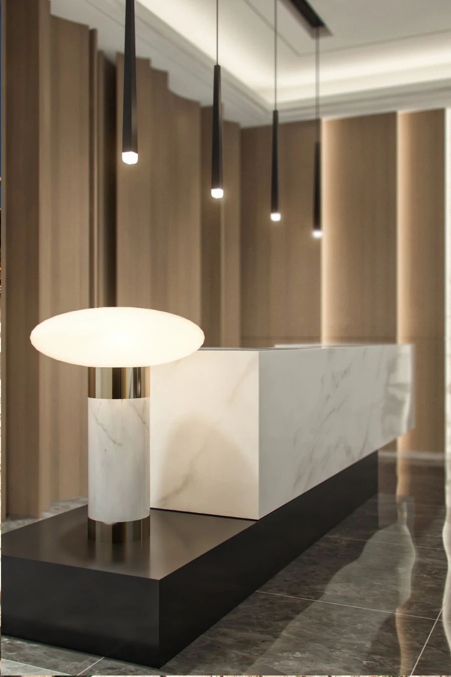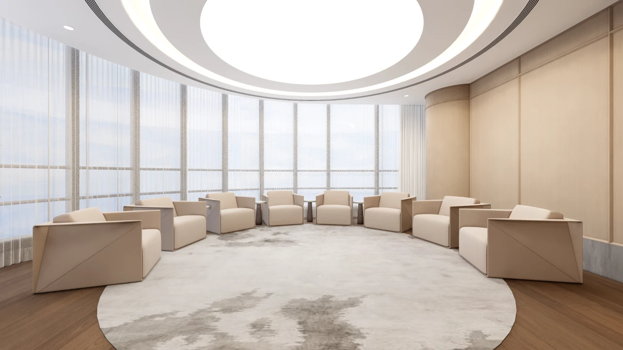 会议桌采用大理石纹路岩板+黑色喷涂金属腿的组合,两种材质互为补色的搭配,饰以弧形长条灯与白色会议椅,凸显整体房间纯净之感。