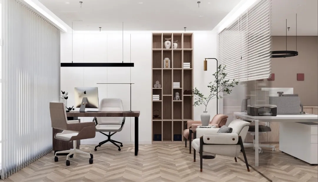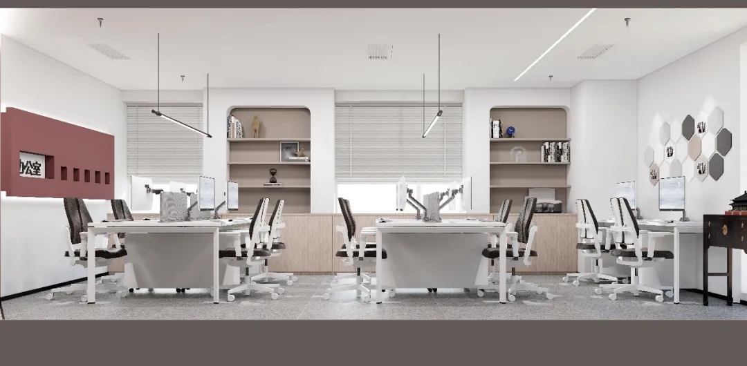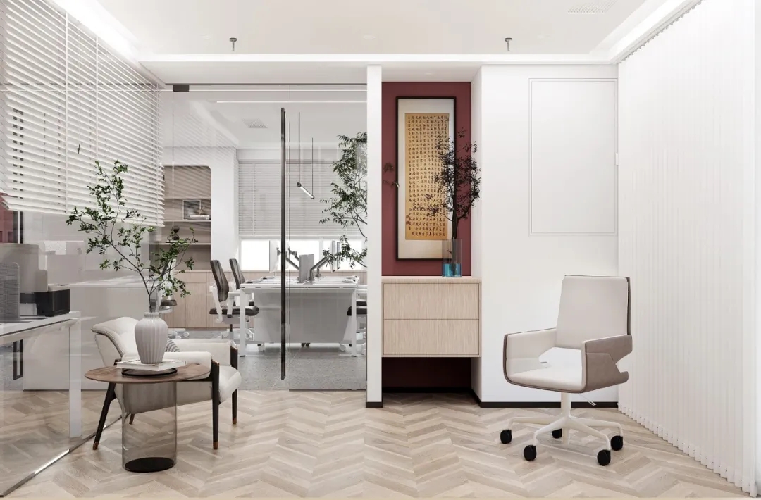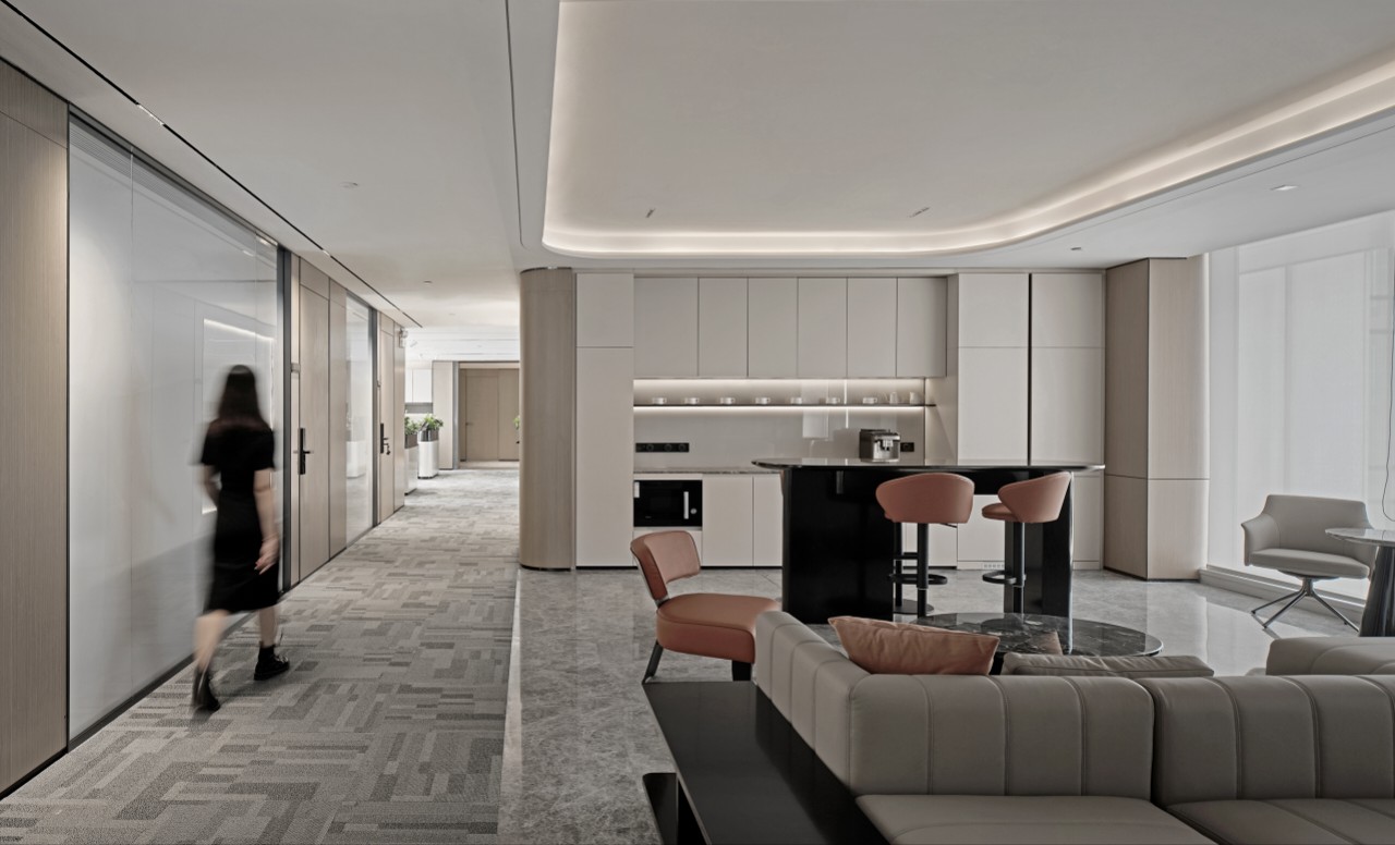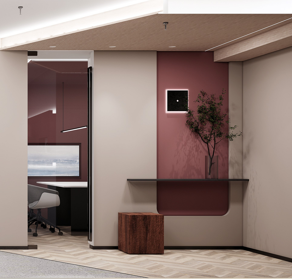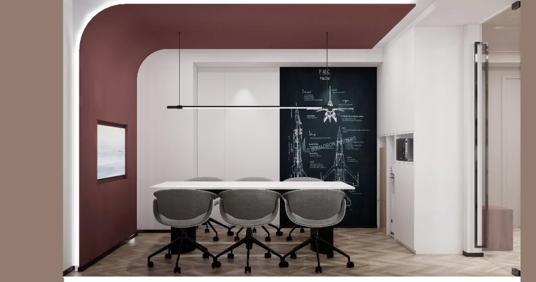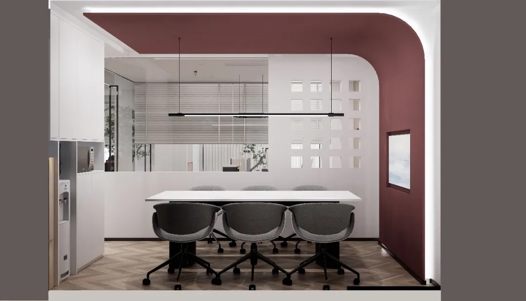 利用调整经理室和财务室后的空间,我们设计了一个小型会议室。会议室南面采用半墙玻璃隔断加镂空墙体设计,将南侧的自然光引进室内。我们将背景墙用弧面造型一直延伸到顶面。让空间有纵向的延伸感。原来堆放在玄关的饮水机,微波炉和电冰箱被收纳入会议室侧柜,除了开会之外,这里平时也可以作为员工的活动室。