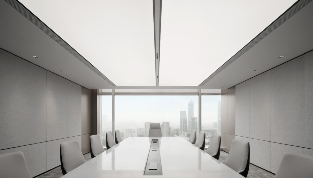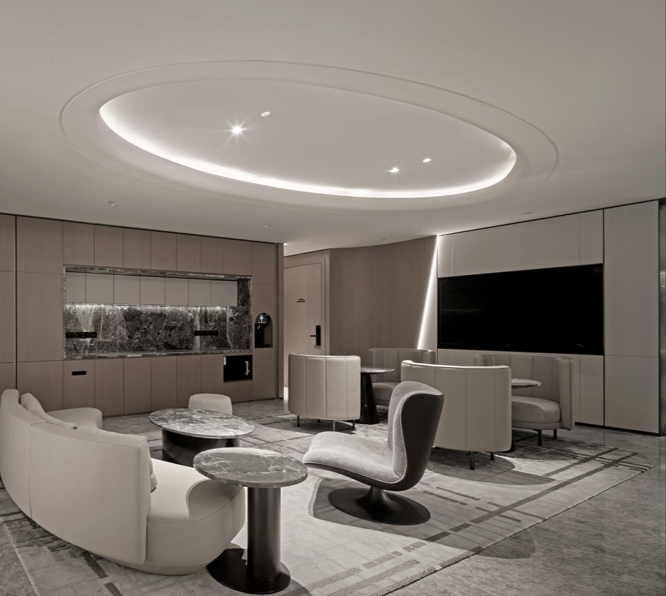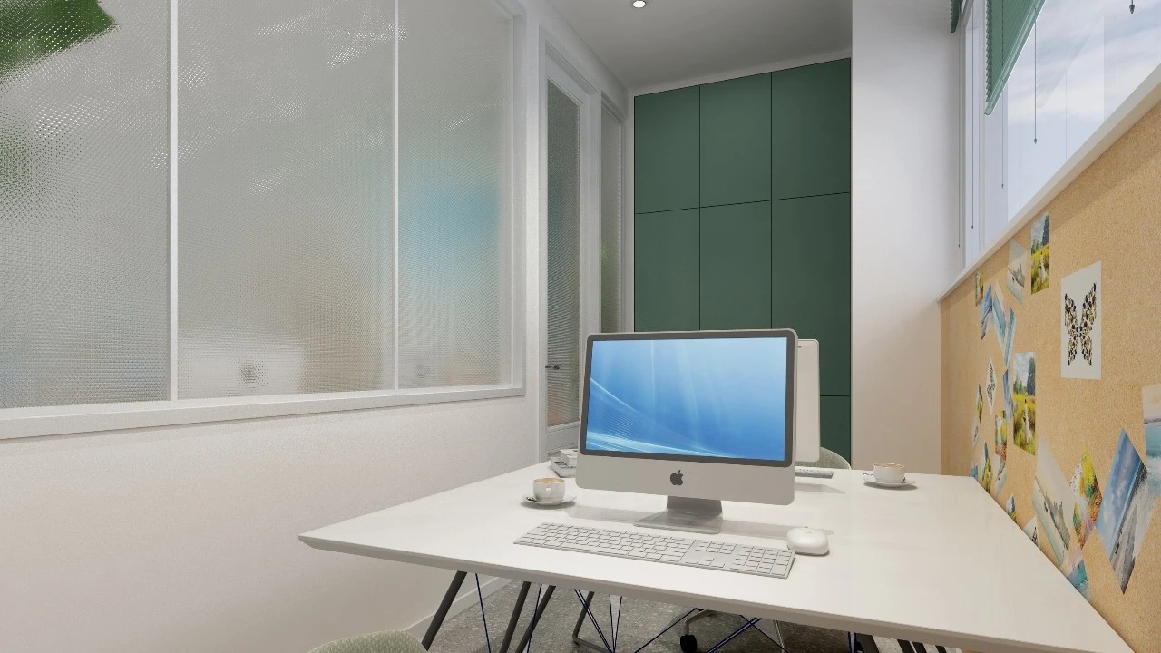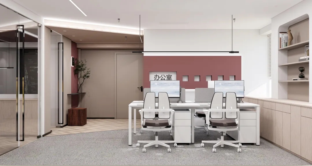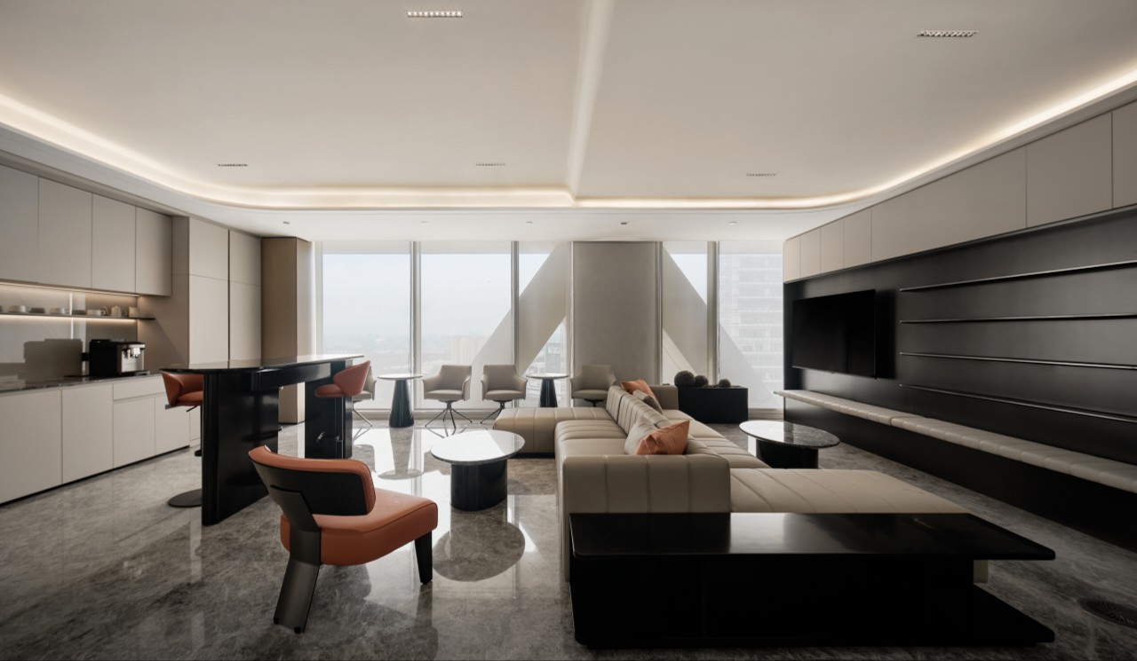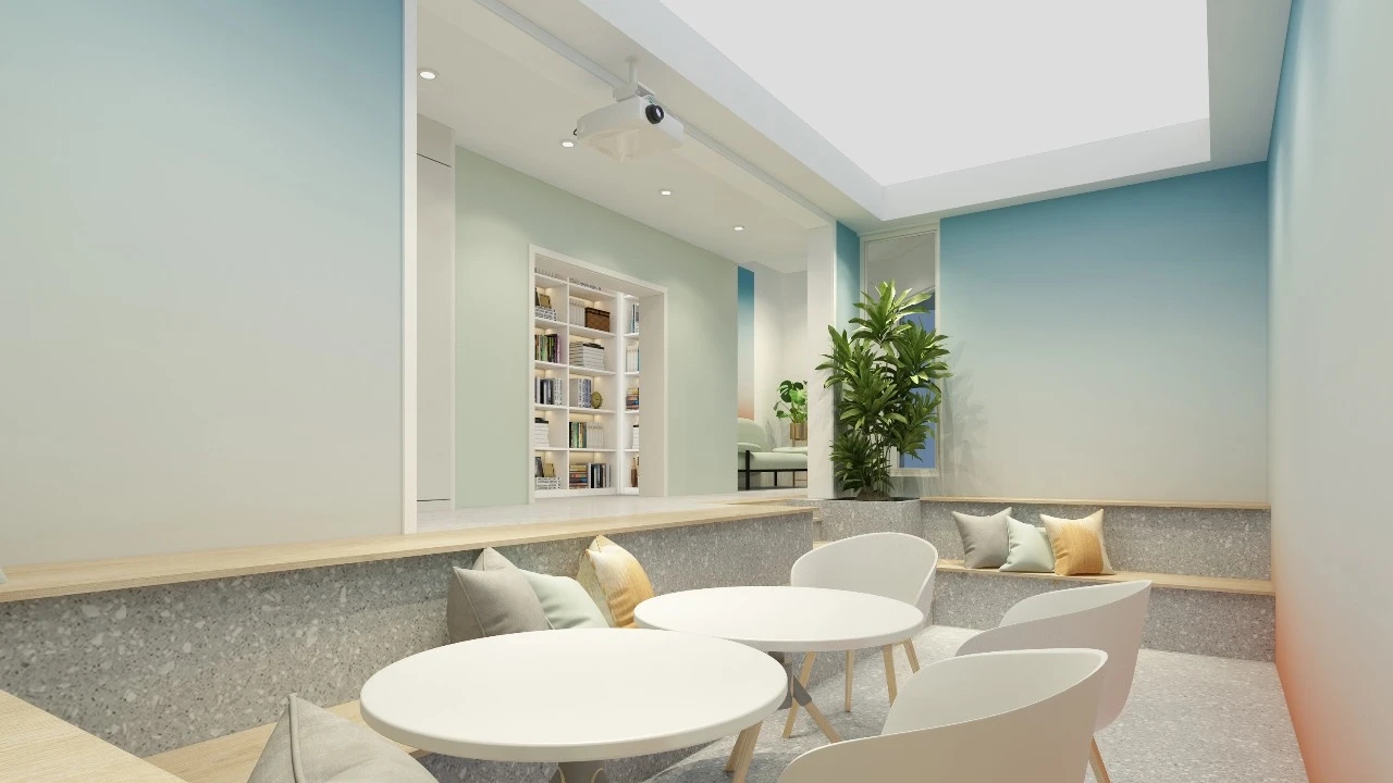 利用调整经理室和财务室后的空间,我们设计了一个小型会议室。会议室南面采用半墙玻璃隔断加镂空墙体设计,将南侧的自然光引进室内。我们将背景墙用弧面造型一直延伸到顶面。让空间有纵向的延伸感。原来堆放在玄关的饮水机,微波炉和电冰箱被收纳入会议室侧柜,除了开会之外,这里平时也可以作为员工的活动室。