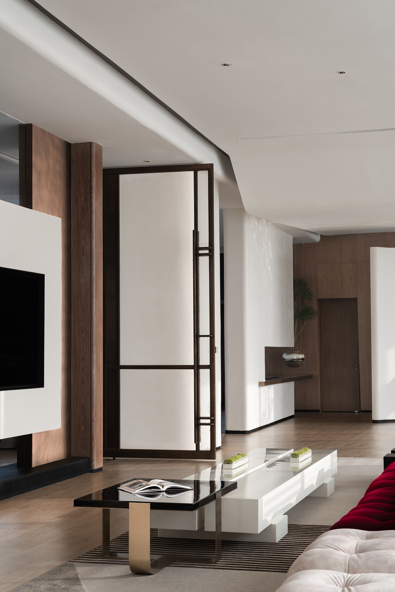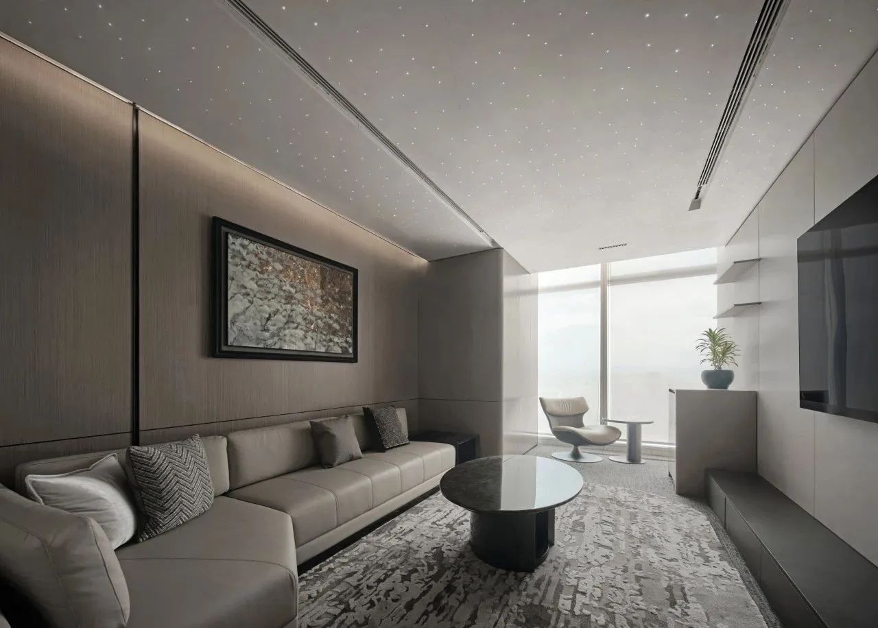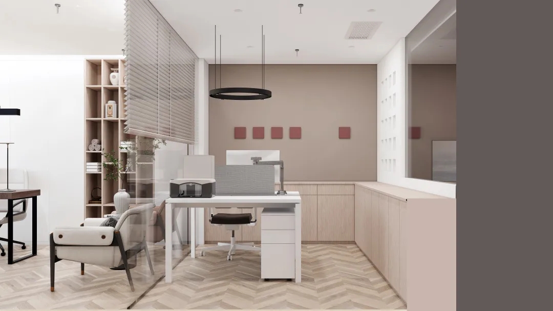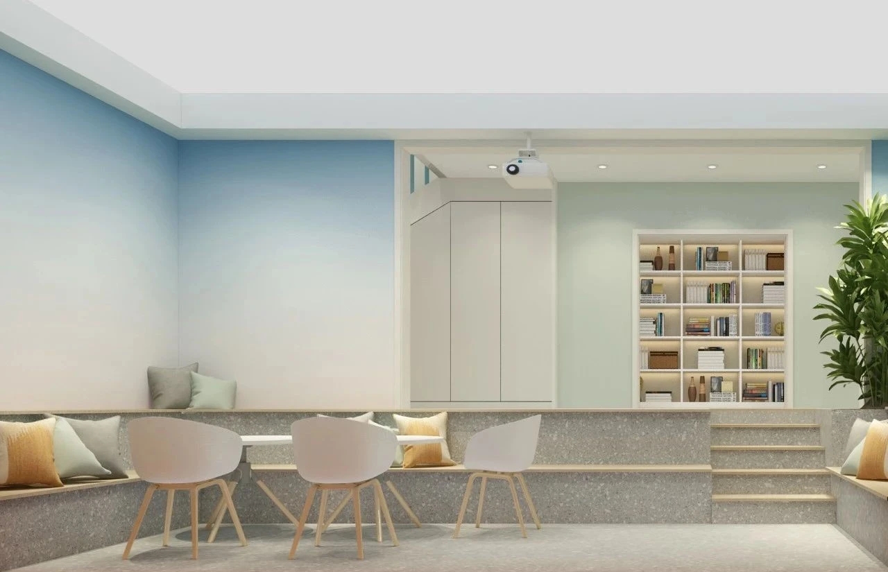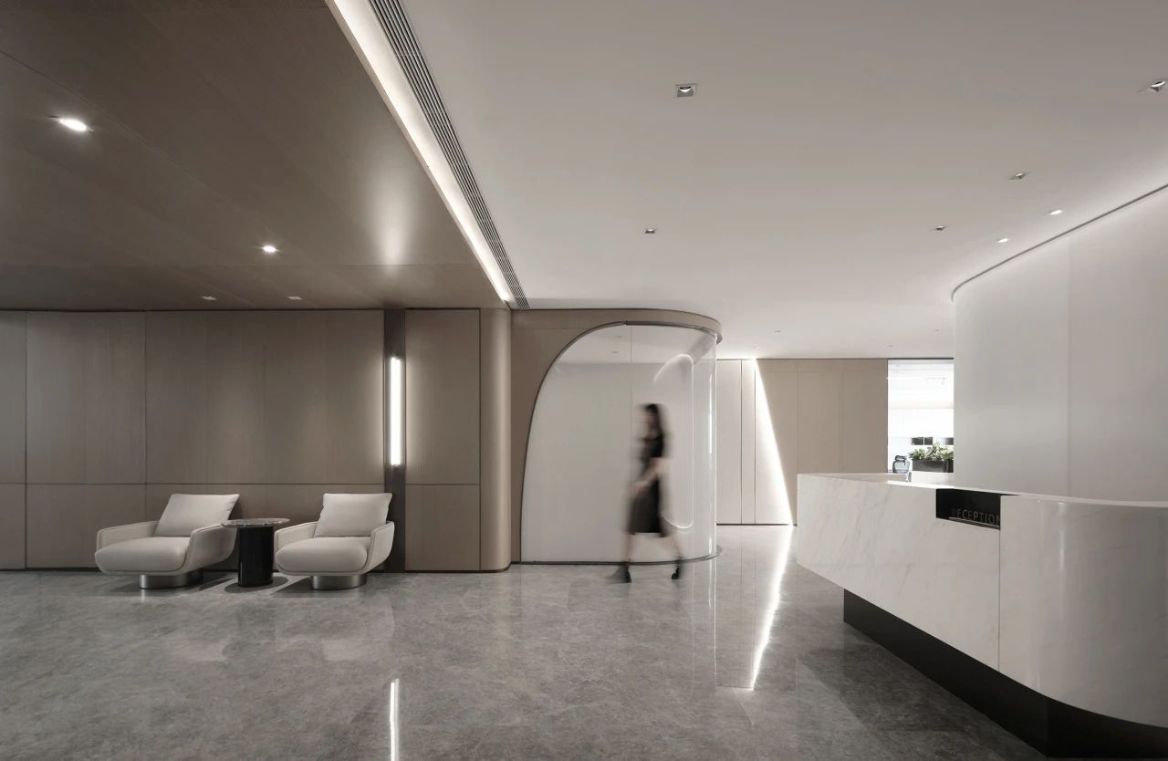 利用调整经理室和财务室后的空间,我们设计了一个小型会议室。会议室南面采用半墙玻璃隔断加镂空墙体设计,将南侧的自然光引进室内。我们将背景墙用弧面造型一直延伸到顶面。让空间有纵向的延伸感。原来堆放在玄关的饮水机,微波炉和电冰箱被收纳入会议室侧柜,除了开会之外,这里平时也可以作为员工的活动室。