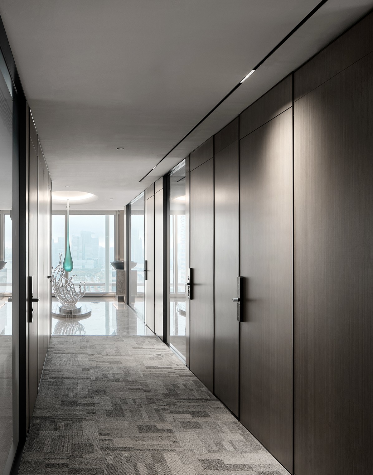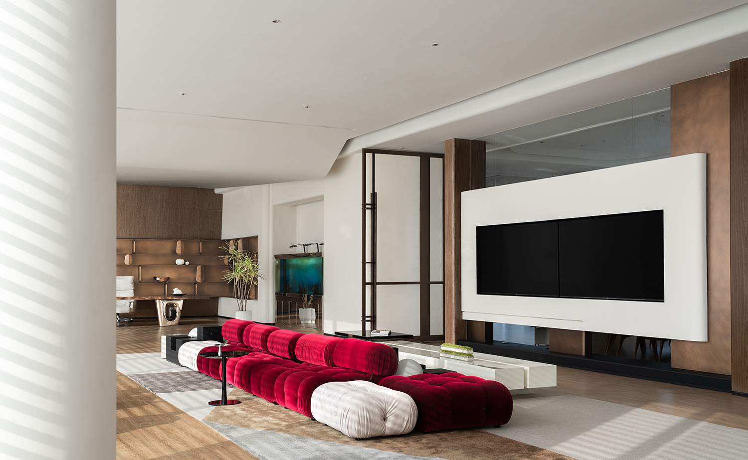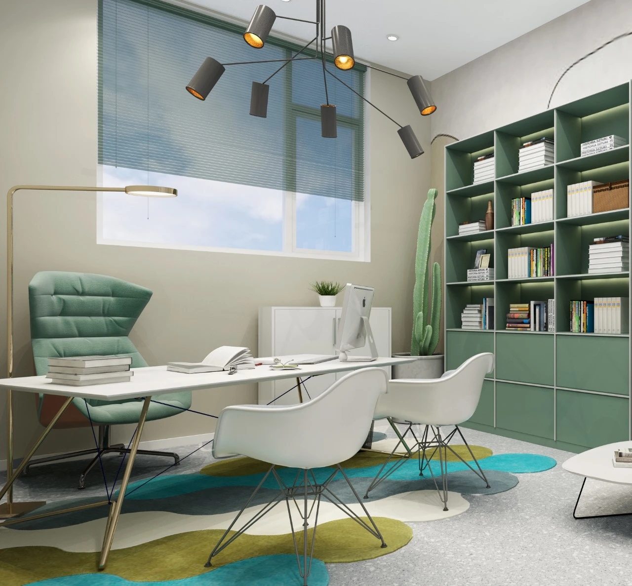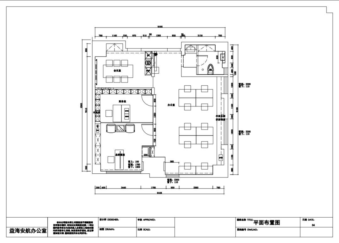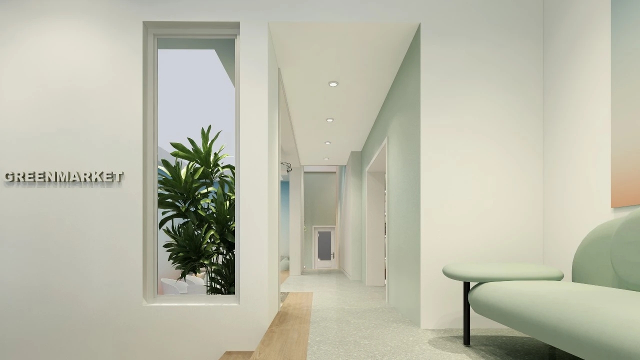 利用调整经理室和财务室后的空间,我们设计了一个小型会议室。会议室南面采用半墙玻璃隔断加镂空墙体设计,将南侧的自然光引进室内。我们将背景墙用弧面造型一直延伸到顶面。让空间有纵向的延伸感。原来堆放在玄关的饮水机,微波炉和电冰箱被收纳入会议室侧柜,除了开会之外,这里平时也可以作为员工的活动室。