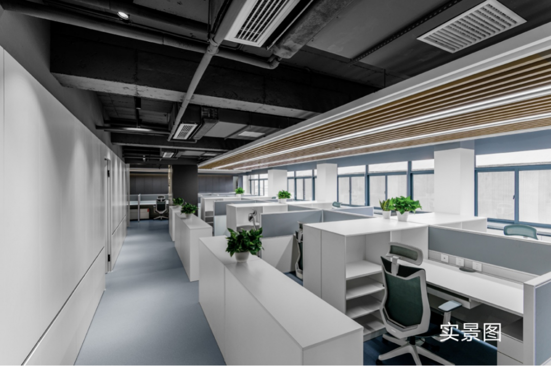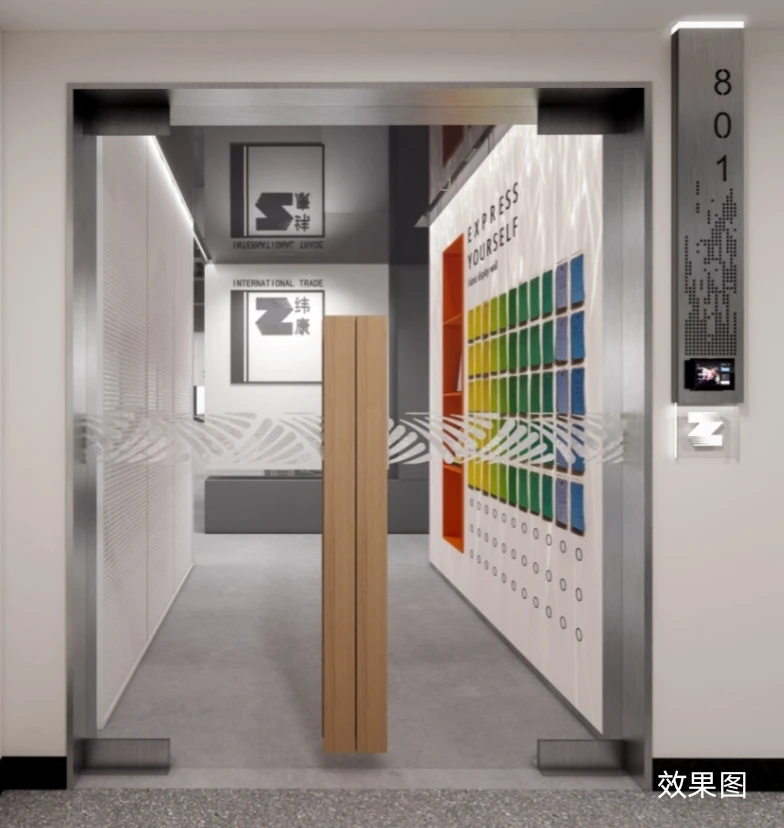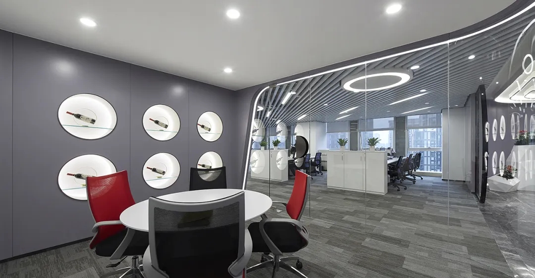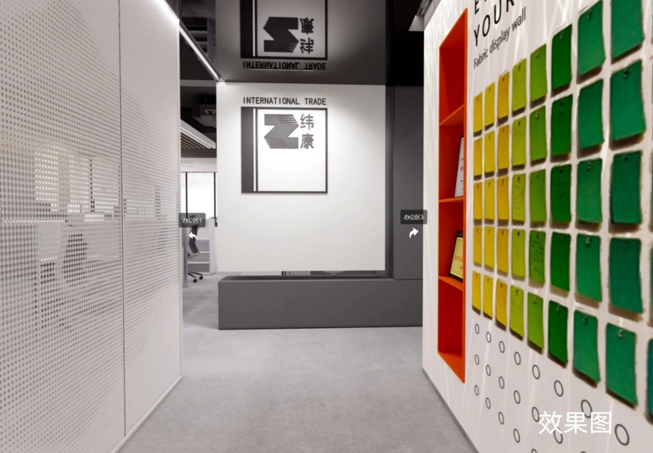 会议室天花以长条平板灯作为主灯,格栅周围使用线性灯绕一圈围成长方形,再将长条平板灯穿插于格栅之间,让天花板有了立体效果。会议室右侧墙设置格子间立体柜,赋予空间更多元素,这里主要承担布料展示功能。