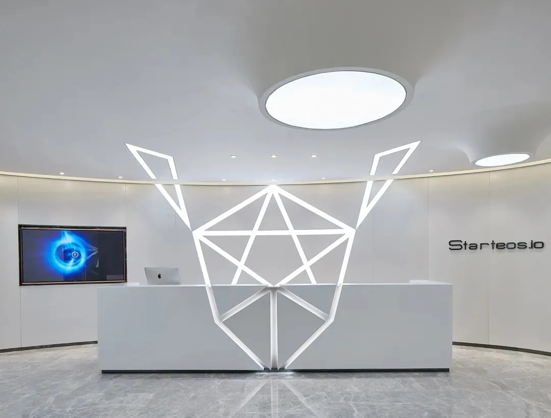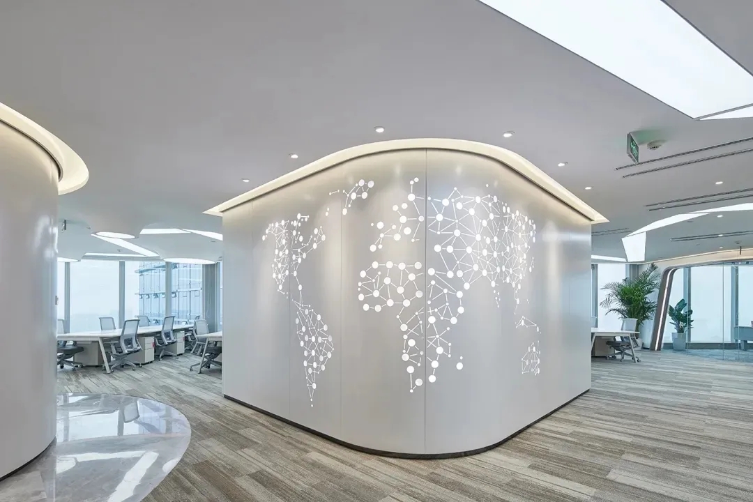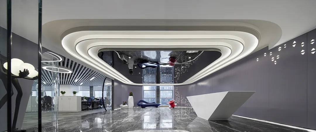 董事长办公室是彰显企业领导风格定位,体现公司形象,表达企业文化价值的一个重要办公场所,因此整体空间设计师还是沿用现代、简约、大气的风格为主。纬康的企业文化中,每个人都有作画的习惯,中间会议桌也是近几年他们一直在绘画中使用的,在甲方的要求下利旧使用,也算是对该公司企业文化的一种传承。为迎合员工经常在此画画的需求,天花板使用灯光软膜作为主体光源意在模仿自然光,墙面采用烤漆玻璃加毛毡板形式,方便董事长在会议中书写及做决策等使用。