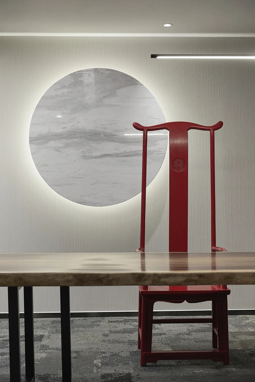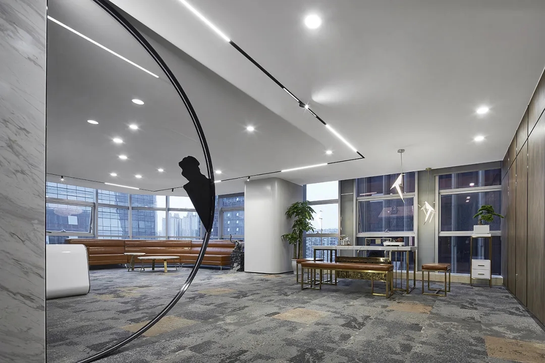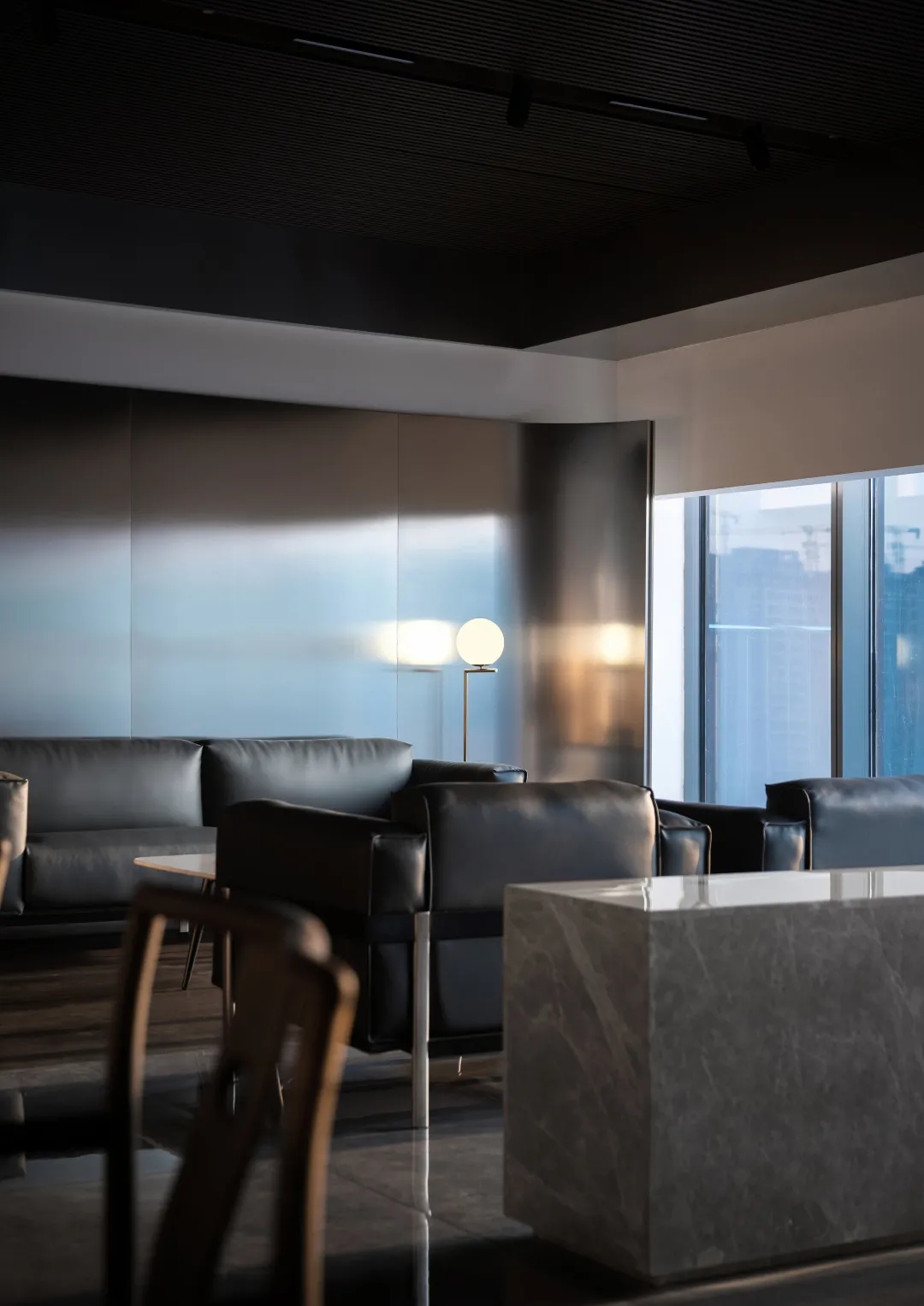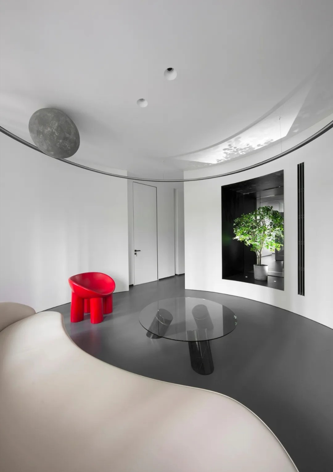 在大面积的黑白二元对立中,曲线以其灵动、柔美,及富有变化的特性,中和了干练,成就了一种简约又时尚的新感官体验,同时也柔化了空间中沟通交流的情绪。