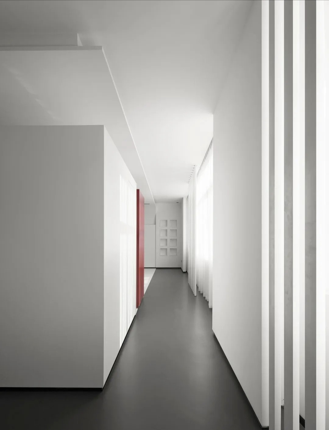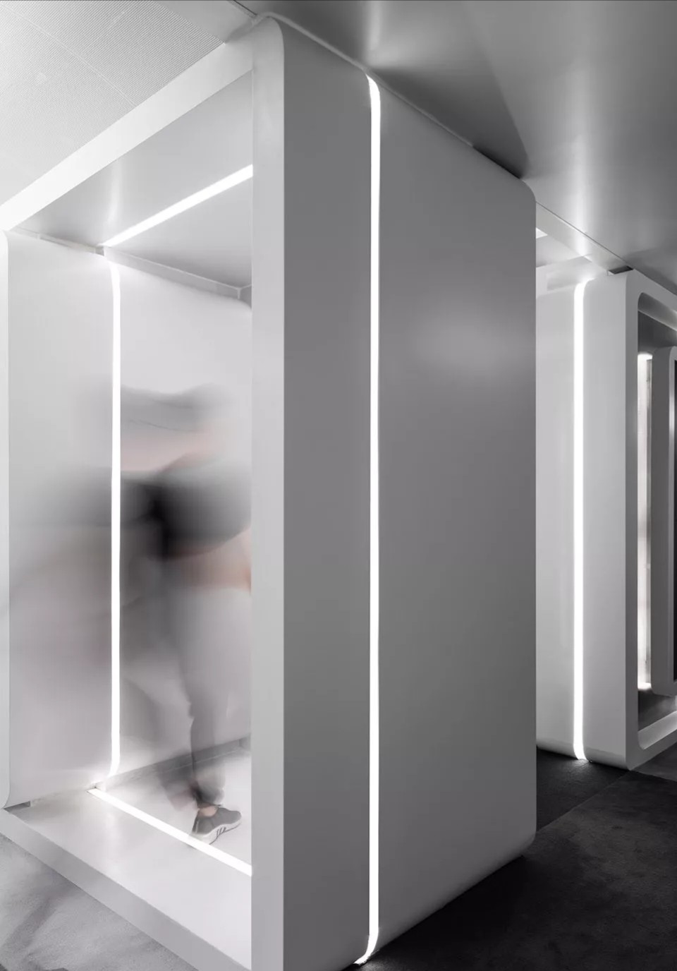 黑白分明的简洁利落,且兼顾品质的艺术性,进口处的盒子空间,奠定了整个设计的基调。欢迎的仪式感,隐藏的光源设定,更增加了其聚焦效果,如深邃的魔盒,吸引着到来者不由自主进入探索。